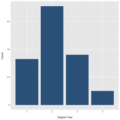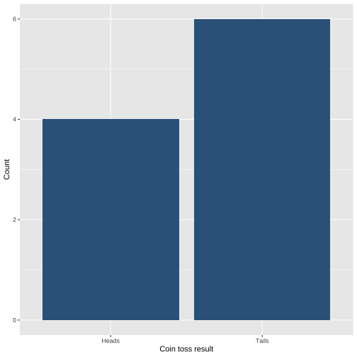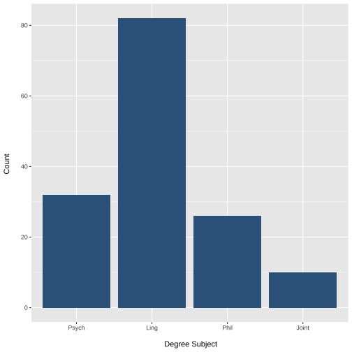The University of Edinburgh ### AY 2020-2021 --- # Weeks Learning Objectives 1. Understand the different quantities used to describe the distributions of data. 2. Understand the appropriate visualization for the distribution of categorical data. 3. Understand methods to calculate the spread for the distribution of categorical data. 4. Understand methods to calculate central tendency for the distribution of categorical data. --- # Topics for today + Last week we looked at definitions of different types of data. + Now we are going to move on to how we describe different types of data. + First, we will look at categorical variables. --- class: center, middle <img src="./figures/DataAnalysis.png" width="70%" /> ??? +Make point that the next 3 weeks are looking at the middle section, whilst practicing the first two + To visualize, we need to introduce the concept of the frequency distribution --- # Recap: Categorical data + Nominal + No order to the levels of the variable + E.g. "Country of residence", "Degree Studied" + 1 = Psychology + 2 = Philosophy + 3 = English Language + We can give each response a numerical value, but convey no meaning beyond group membership -- + Ordinal + Numerical values denote order. + E.g. "Level of Education" + 1 = GCSE + 2 = A-level + 3 = University undergraduate degree + 4 = University postgraduate degree --- # Frequency Distribution > **"a mathematical function showing the number of instances in which a variable takes each of its possible values."** + Or put simply > **A plot showing the number of instances of each value of a variable** --- # An example .pull-left[ + I toss a coin 10 times + I plot the number of instances of head and tails. ] .pull-right[ <!-- --> ] --- # Plotting fundamentals .pull-left[ + There are many types of graph, all of which are intended to summarise different types of data, or the relations between data. + We are going to spend a lot of time dealing with plots this semester. + Let's pause for a moment and consider the basic structure ] .pull-right[ <!-- --> ] --- # Plotting fundamentals .pull-left[ + Data + Axes + (aesthetics in `ggplot` language - also includes size, colours etc.) + Axes have scales + Geometric objects + (`geoms` in `ggplot` language; i.e. bars, points, lines) ] .pull-right[ <!-- --> ] --- # Bar plot .pull-left[ + Bar plots are used to show frequency distributions of categorical variables. + Our example: + **Data** = result of our 10 coin tosses. + **X-axis**: values of variable (here "Heads" or "Tails) + Scale = two discrete values + **Y-axis**: Frequency + Scale = count ] .pull-right[ <!-- --> ] --- # Bar plot .pull-left[ ```r df %>% ggplot(., aes(x=dat)) + geom_bar(fill="steelblue4") + labs(x = "Coin toss result", y = "Count") + scale_x_discrete(labels = c("Heads", "Tails")) ``` + `df` = data set + `aes(x=dat)` = the variable `dat` is used on x-axis + `geom_bar()` = make a bar plot + `fill="steelblue4"` = make the bars blue + `labs` = what to label each axis + `scale_x_discrete` = what to label to tick marks on the x-axis ] .pull-right[ <!-- --> ] --- # A more realistic example .pull-left[ + Suppose I am running a stats summer school. + It is open to all students in PPLS + All degrees + All years + I gather data on all 150 attendees. + `ID` = unique identifier + `Degree` = degree studied + `Year` = year of study + `Score1` = pre-summer school score + `Score2` = post-summer school score + Let's describe `Degree` and `Year` ] .pull-right[ **Data from 10 participants** <table> <thead> <tr> <th style="text-align:left;"> ID </th> <th style="text-align:left;"> Degree </th> <th style="text-align:right;"> Year </th> <th style="text-align:right;"> Score1 </th> <th style="text-align:right;"> Score2 </th> </tr> </thead> <tbody> <tr> <td style="text-align:left;"> ID101 </td> <td style="text-align:left;"> Psych </td> <td style="text-align:right;"> 2 </td> <td style="text-align:right;"> 71 </td> <td style="text-align:right;"> 74 </td> </tr> <tr> <td style="text-align:left;"> ID102 </td> <td style="text-align:left;"> Ling </td> <td style="text-align:right;"> 2 </td> <td style="text-align:right;"> 65 </td> <td style="text-align:right;"> 72 </td> </tr> <tr> <td style="text-align:left;"> ID103 </td> <td style="text-align:left;"> Ling </td> <td style="text-align:right;"> 2 </td> <td style="text-align:right;"> 64 </td> <td style="text-align:right;"> 72 </td> </tr> <tr> <td style="text-align:left;"> ID104 </td> <td style="text-align:left;"> Phil </td> <td style="text-align:right;"> 1 </td> <td style="text-align:right;"> 69 </td> <td style="text-align:right;"> 74 </td> </tr> <tr> <td style="text-align:left;"> ID105 </td> <td style="text-align:left;"> Ling </td> <td style="text-align:right;"> 3 </td> <td style="text-align:right;"> 62 </td> <td style="text-align:right;"> 69 </td> </tr> <tr> <td style="text-align:left;"> ID106 </td> <td style="text-align:left;"> Ling </td> <td style="text-align:right;"> 1 </td> <td style="text-align:right;"> 68 </td> <td style="text-align:right;"> 72 </td> </tr> <tr> <td style="text-align:left;"> ID107 </td> <td style="text-align:left;"> Phil </td> <td style="text-align:right;"> 3 </td> <td style="text-align:right;"> 66 </td> <td style="text-align:right;"> 75 </td> </tr> <tr> <td style="text-align:left;"> ID108 </td> <td style="text-align:left;"> Psych </td> <td style="text-align:right;"> 1 </td> <td style="text-align:right;"> 64 </td> <td style="text-align:right;"> 71 </td> </tr> <tr> <td style="text-align:left;"> ID109 </td> <td style="text-align:left;"> Psych </td> <td style="text-align:right;"> 3 </td> <td style="text-align:right;"> 65 </td> <td style="text-align:right;"> 73 </td> </tr> <tr> <td style="text-align:left;"> ID110 </td> <td style="text-align:left;"> Ling </td> <td style="text-align:right;"> 1 </td> <td style="text-align:right;"> 64 </td> <td style="text-align:right;"> 72 </td> </tr> </tbody> </table> ] --- # Bar plot for `Degree` .pull-left[ ```r ex1 %>% ggplot(., aes(x=Degree)) + geom_b