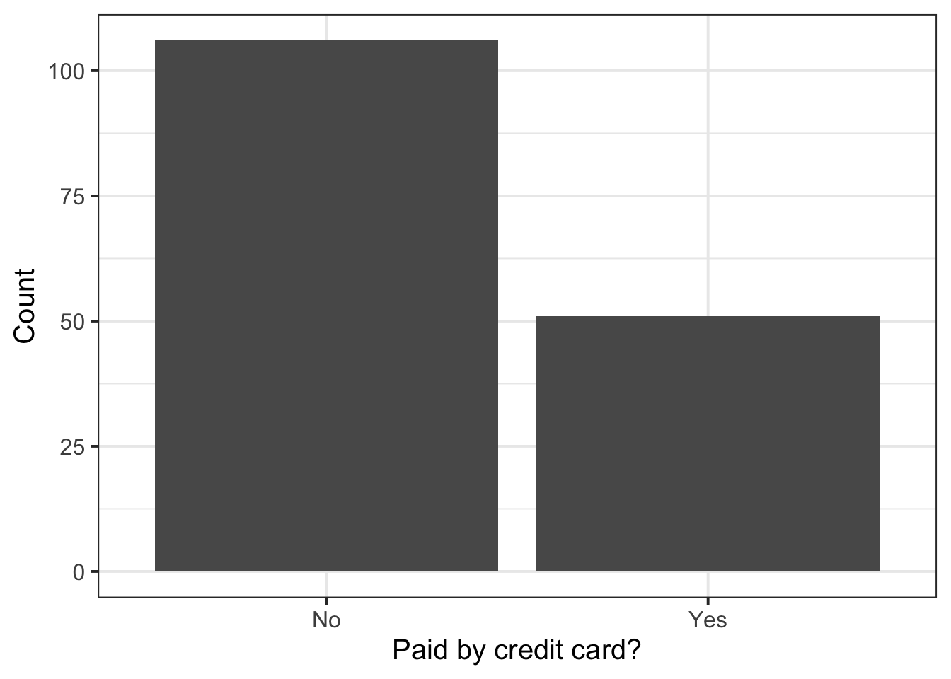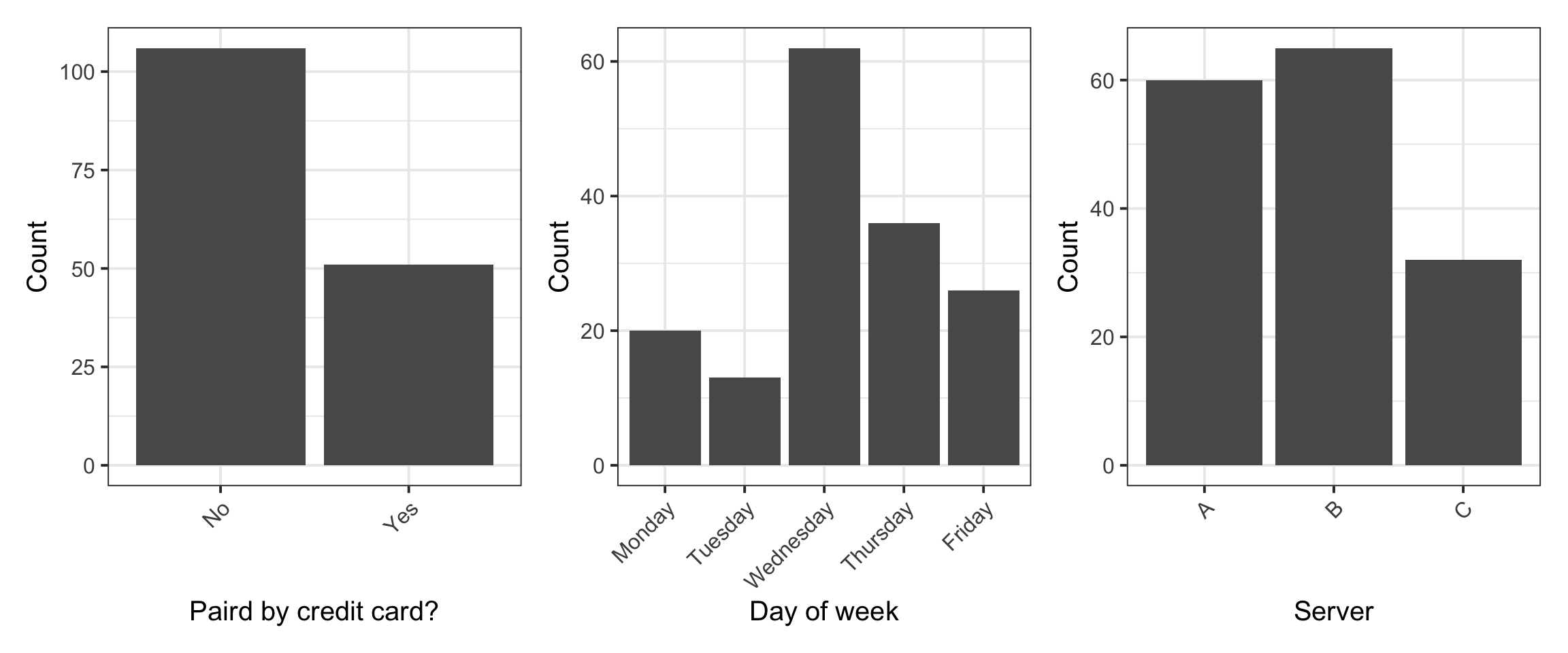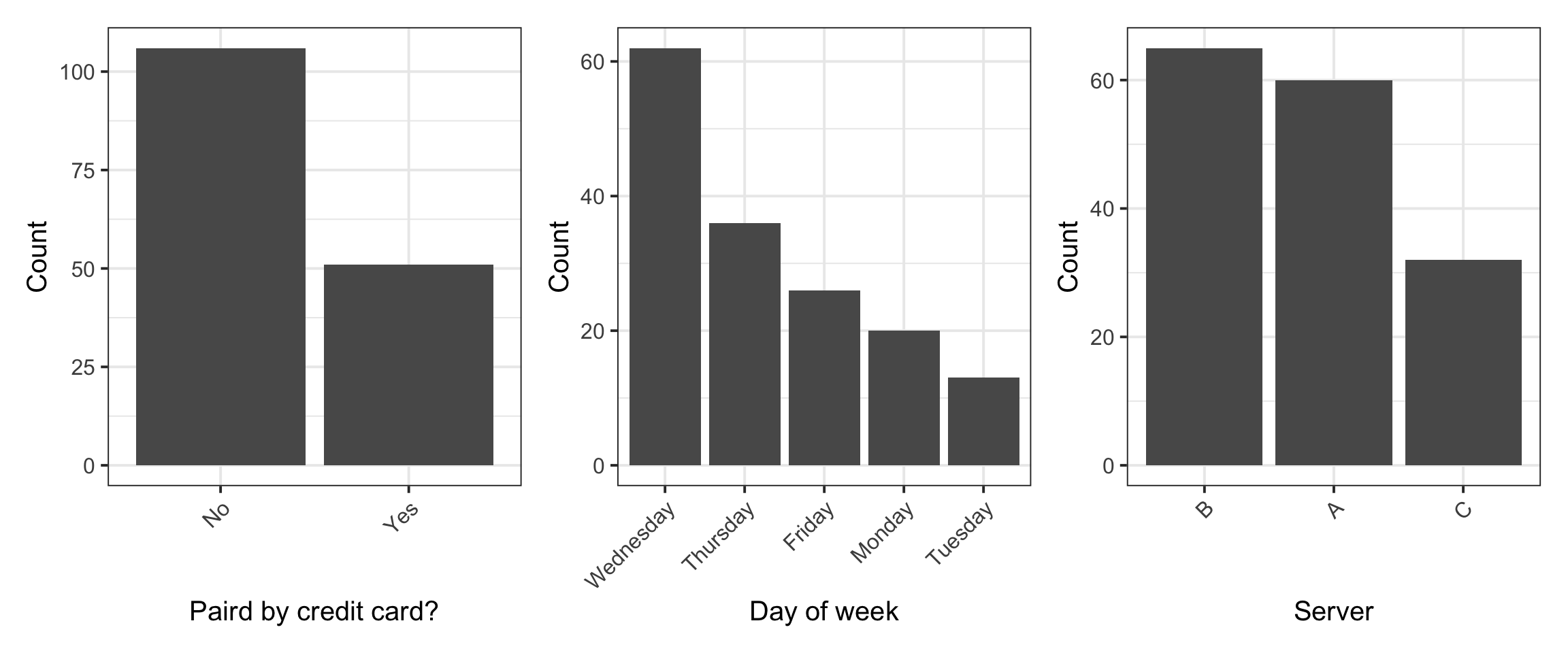 From the univariate distribution (or marginal distribution) of each categorical variable we see that the most common payment method was not a credit card, and the most common day of the week to dine at that restaurant was Wednesday, followed by Thursday and Friday. Finally, most parties were waited on by server B.