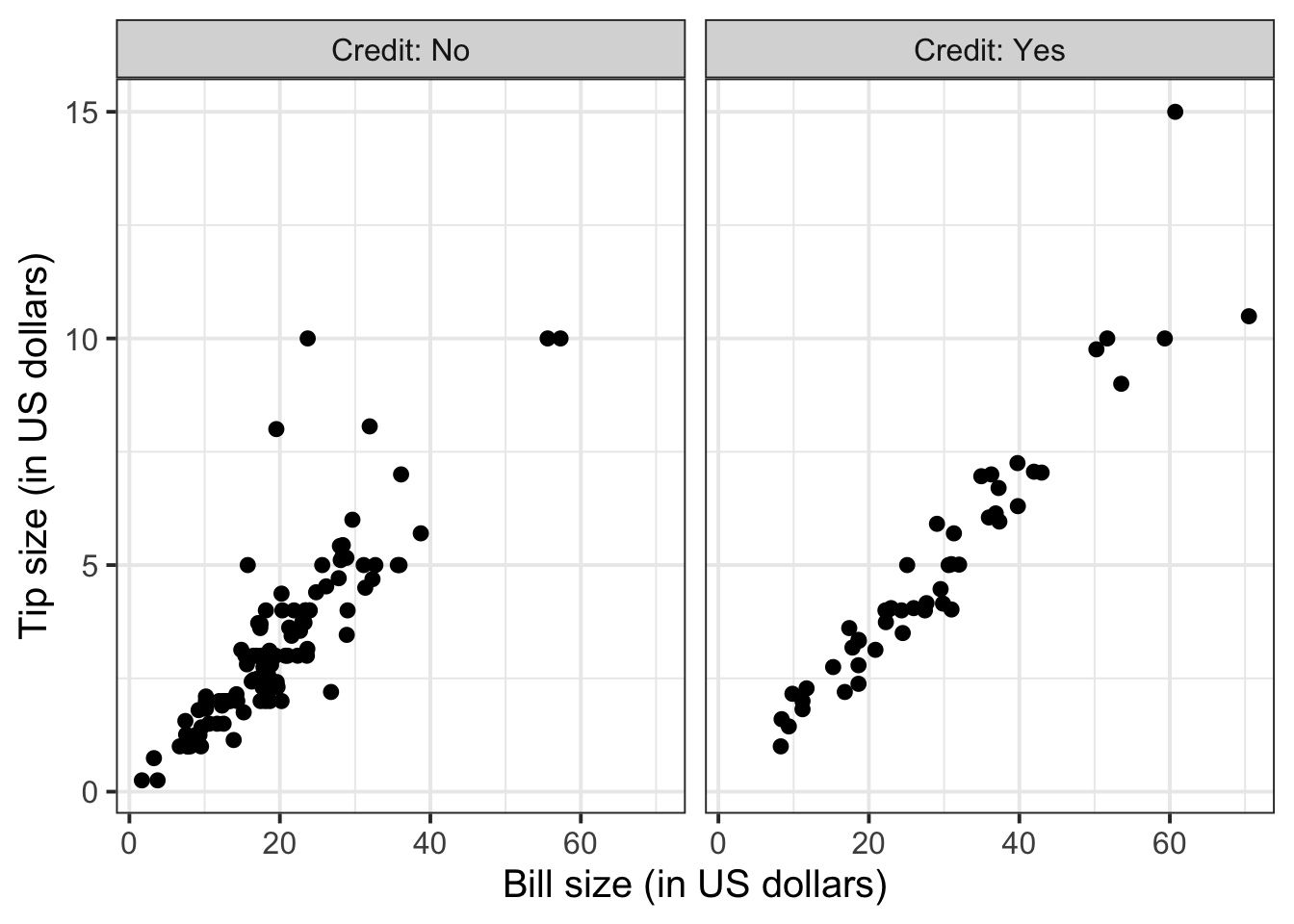 To investigate the relationship between bill and tip size for those who paid by credit card and those who didn’t we can create faceted scatterplots: