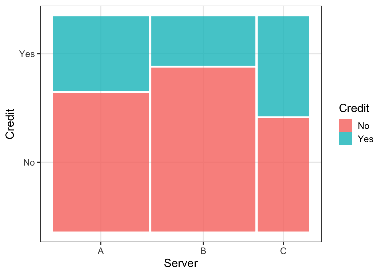 geom_mosaic(aes(x = product(Credit, Server), fill=Credit)) +
