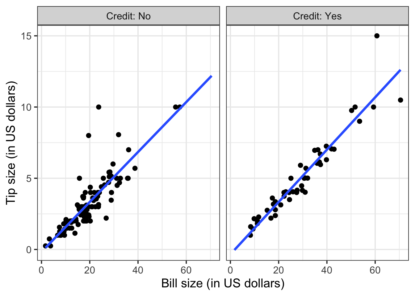 To investigate the relationship between bill and tip size for those who paid by credit card and those who didn’t we can create faceted scatterplots: