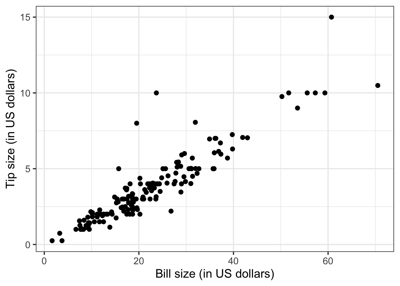 tips$PctTip[tips$PctTip > 100] <- NAConsider, for example, the relationship between bill and tip size. As these are two numerical variables, we visualise the relationship with a scatterplot: