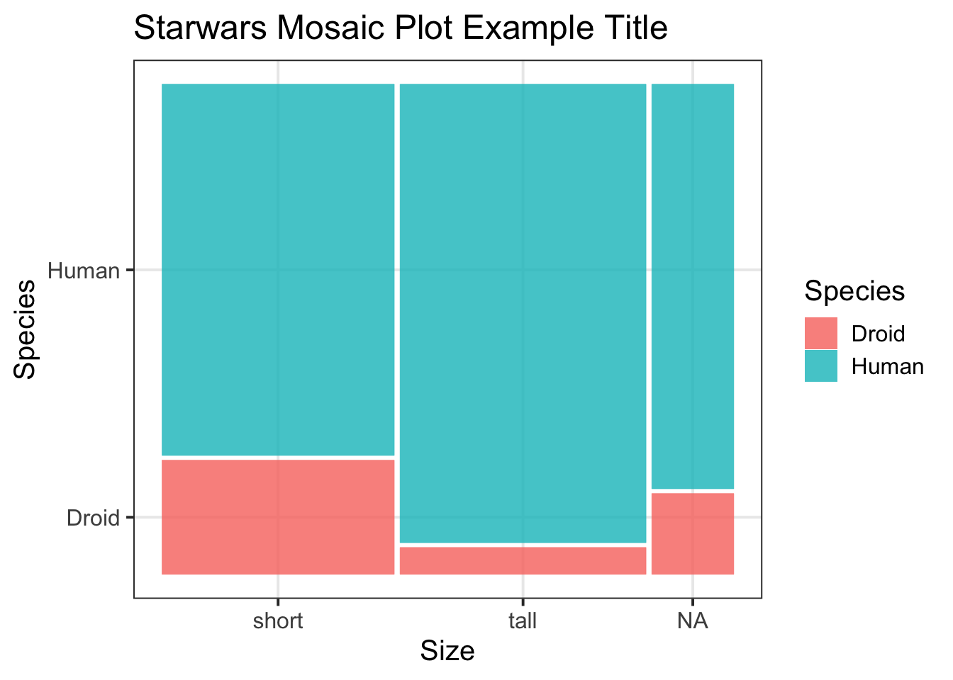 starwarsdataset, I do haveNAs in my ‘size’ variable, so I need to remove these before re-plotting:↩︎library(ggmosaic) m_plot <- ggplot(starwars2) + geom_mosaic(aes(x = product(species, size), fill = species)) + labs(title = "Starwars Mosaic Plot Example Title", x = "Size", y = "Species", fill = "Species") m_plot