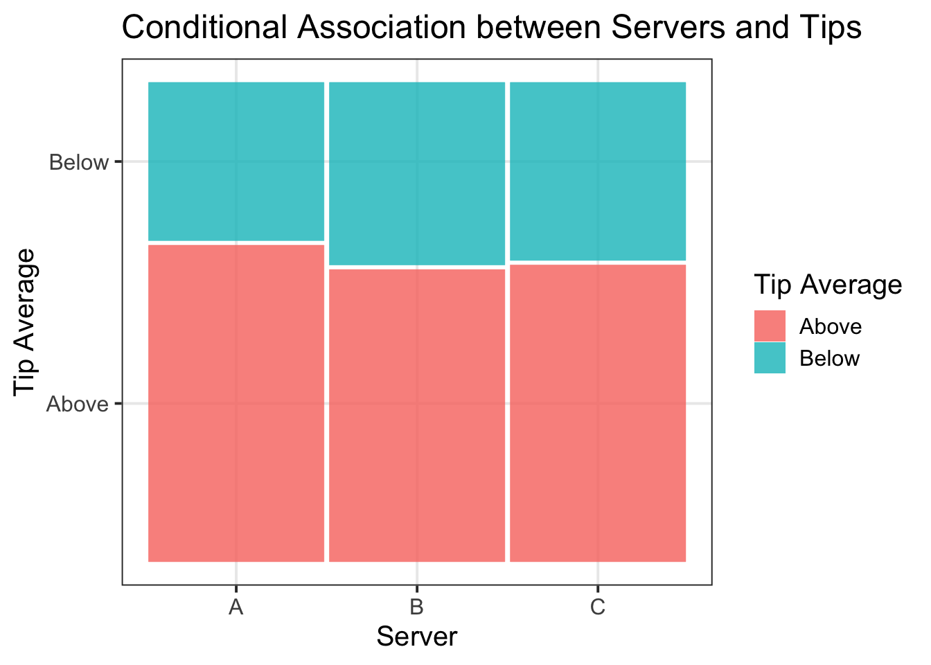 It was more likely for customers to tip above (64%) than below (36%) average. Though it was likely that all servers would receive an above average tip, tipping did not appear to be independent of server, based on conditional probabilities. Based on their personal tips, Server A appeared to offer the best service, where they were more likely to receive an above average tip (67%). Servers B and C were almost equally likely to receive above average tips (62% and 63% respectively). These associations are visually represented in Figure 2. Furthermore, among all customers that tipped below average, the majority was served by B or C (65%).