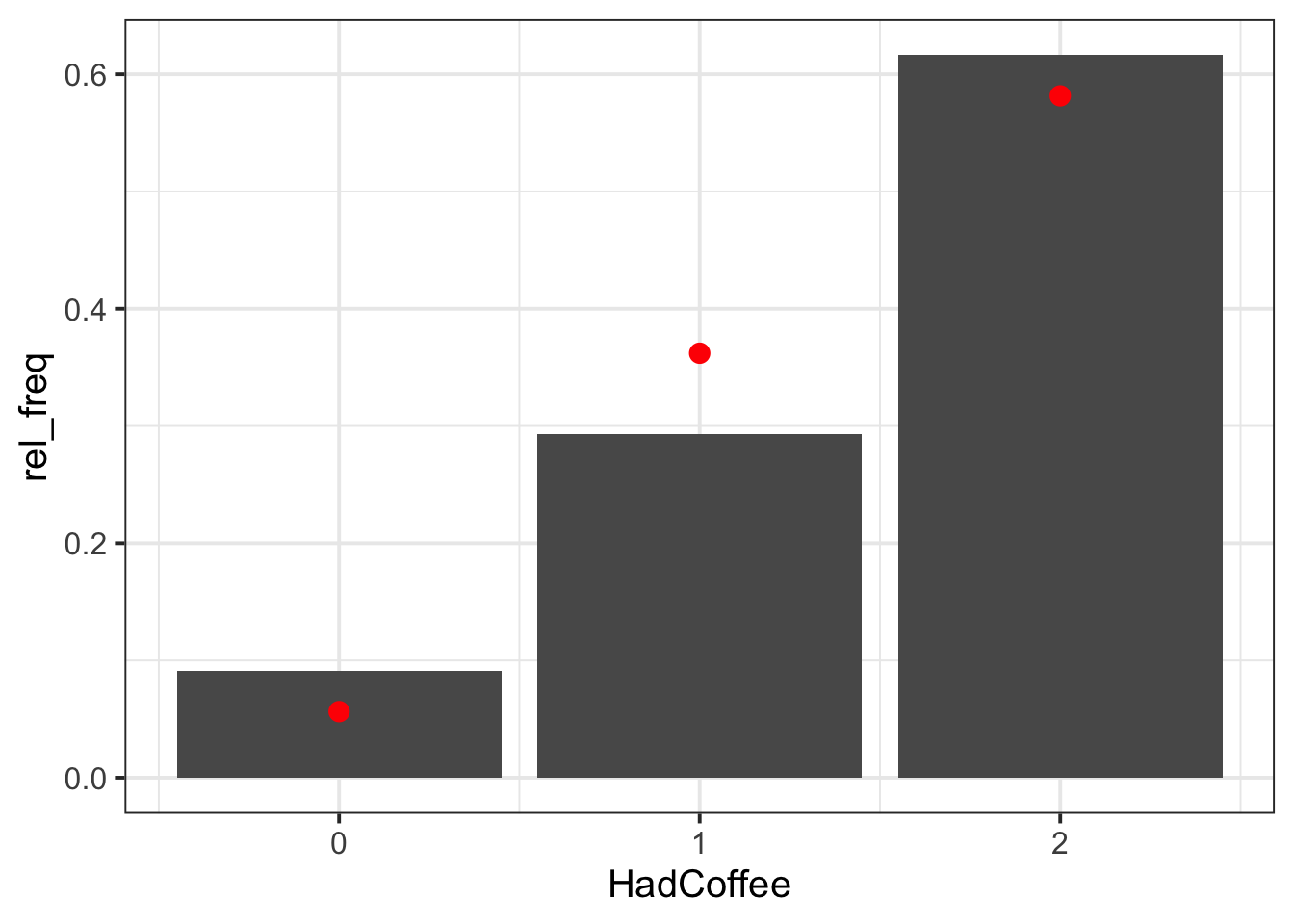 Plot the frequency distribution of the discrete variable HadCoffee using a barplot. As we already have the x values (HadCoffee) and the y values (the height of the bars, rel_freq), we use geom_col().