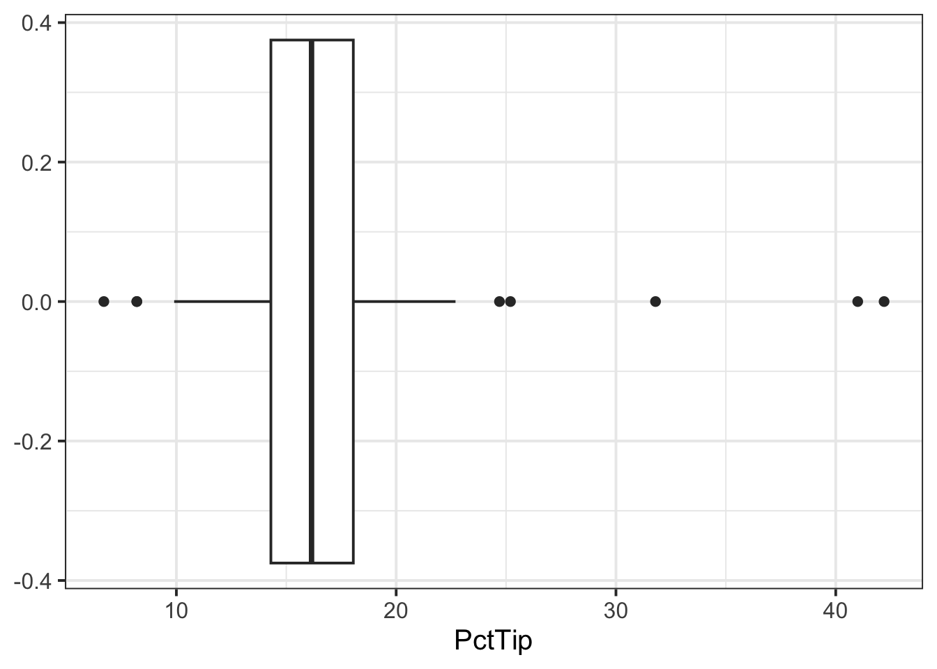 - If we were asked to visualise the shape of the distribution of the ‘PctTip’ variable, we could use either a histogram, a density plot, or a boxplot: