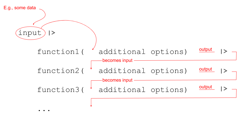 We’re going to use this way of writing a lot throughout the course, and it pairs really well with a group of functions in the tidyverse packages, which were designed to be used in conjunction with |>.