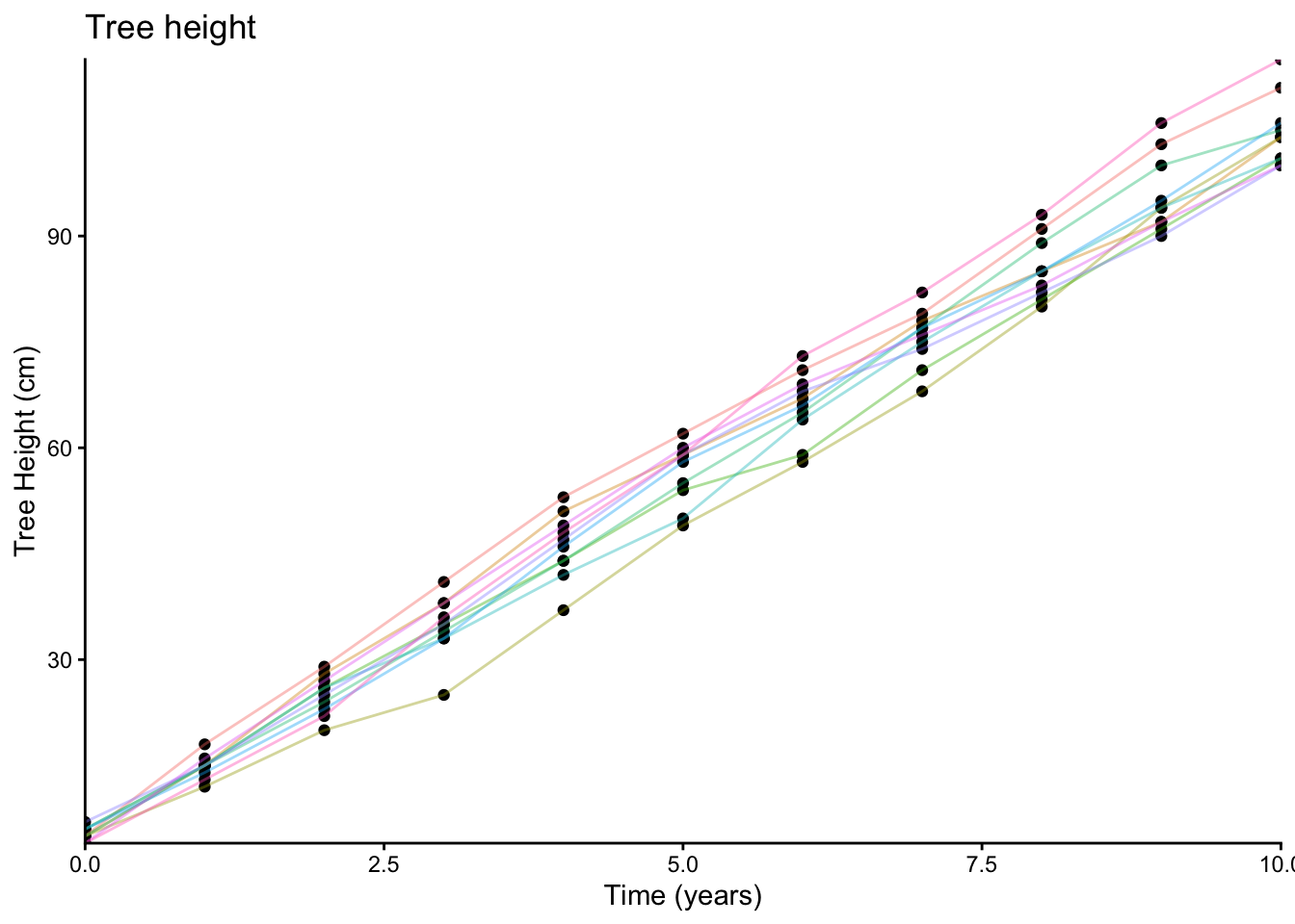 Imagine that we plant 10 trees, and measure their heights each year for 10 years. We could visualise this data (the relationship between time and tree height) on a scatterplot (we have added some lines to the plot to show which tree is which):