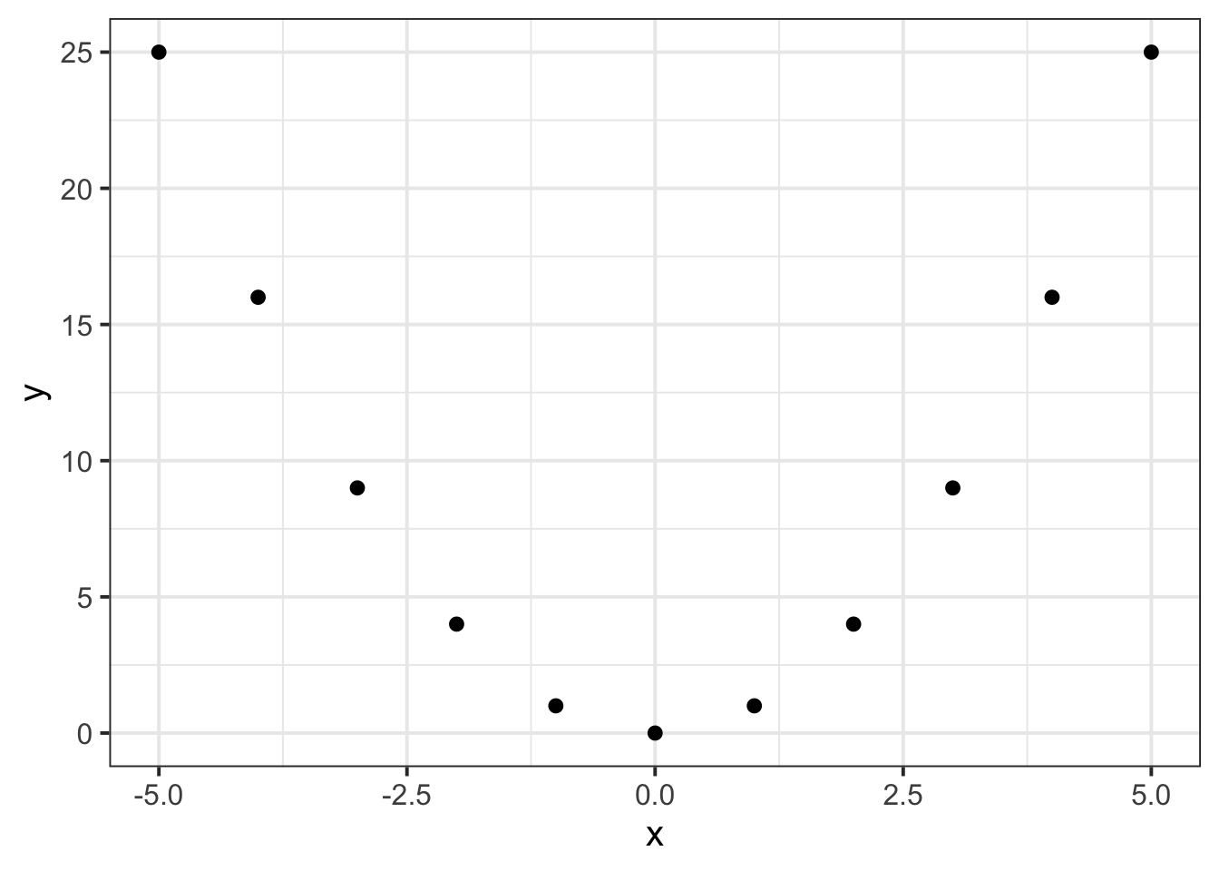 \[x=\begin{bmatrix} -5 \\ -4 \\ -3 \\ -2 \\ -1 \\ 0 \\ 1 \\ 2 \\ 3 \\ 4 \\ 5 \end{bmatrix}, \qquad y=\begin{bmatrix} 25 \\ 16 \\ 9 \\ 4 \\ 1 \\ 0 \\ 1 \\ 4 \\ 9 \\ 16 \\ 25 \end{bmatrix}\]