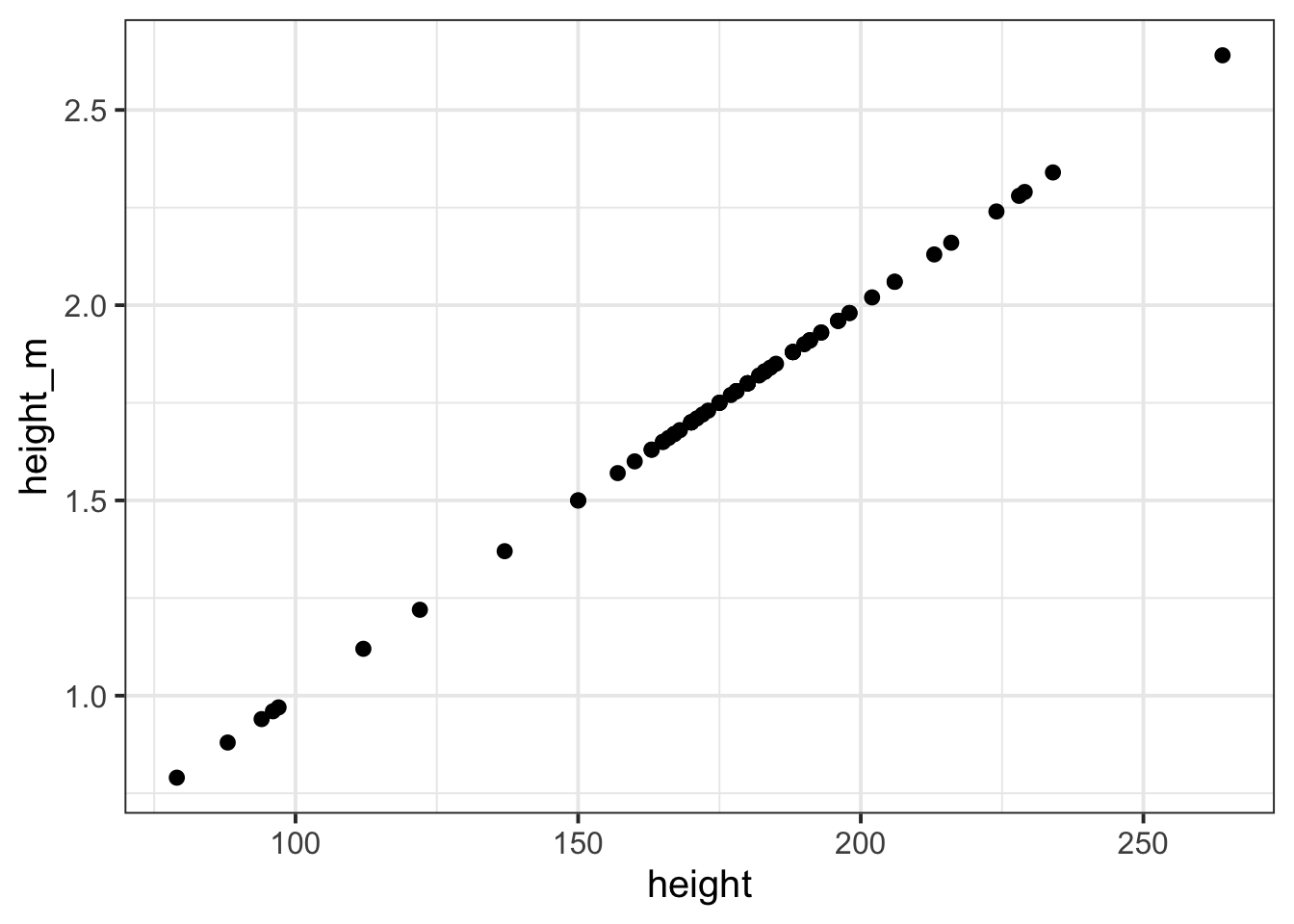 We could even plot the heights in cm and heights in m against one another (note what units are on each axis):