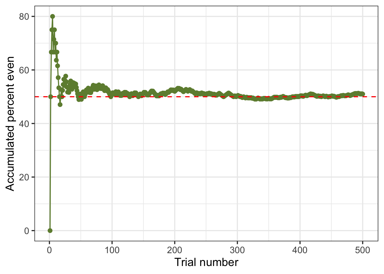 num_trials <- 500Next, we repeat the experiment num_trials times and compute the accumulated percentage of even outcomes: