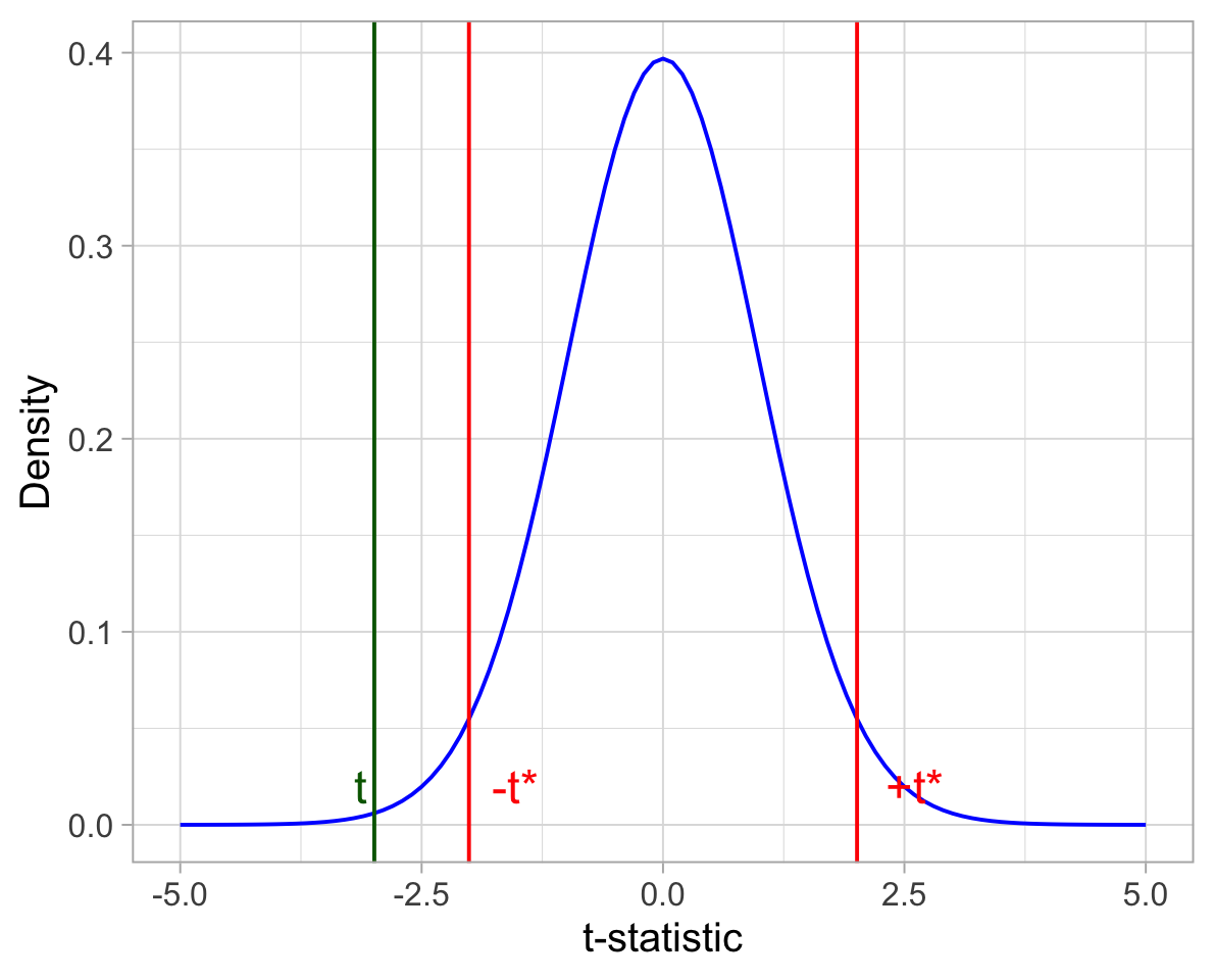 - we reject the null hypothesis \(H_0\) whenever the observed t-statistic lies beyond the critical values: