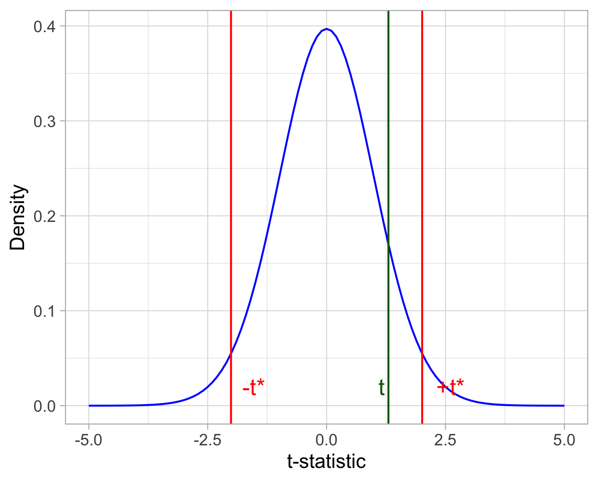 - we do not reject the null hypothesis \(H_0\) whenever the observed t-statistic lies within the critical values: