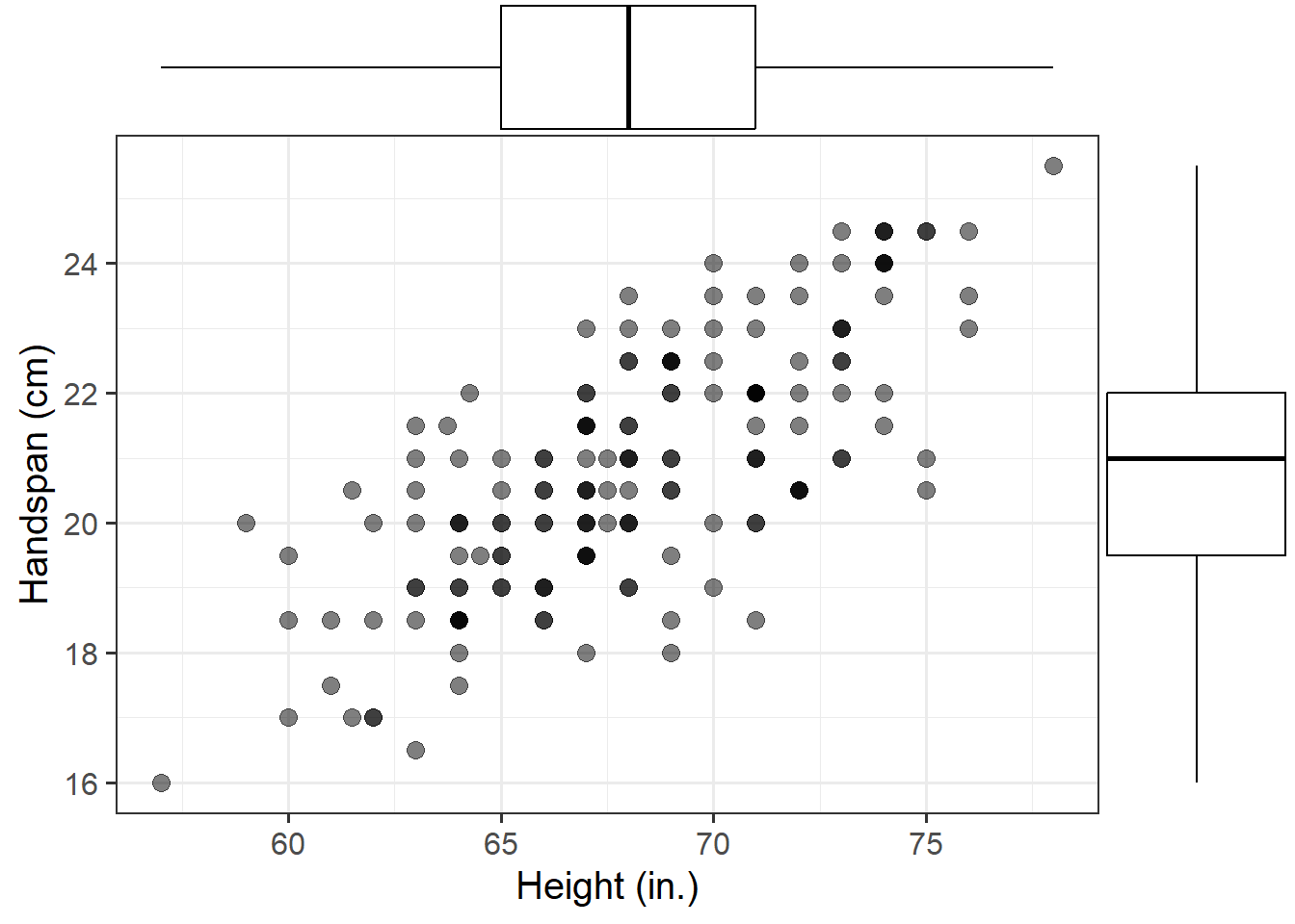Consider now the association between height (in inches) and handspan (in cm). Utts and Heckard (2015) provided data for a sample of 167 students which reported their height and handspan as part of a class survey.
