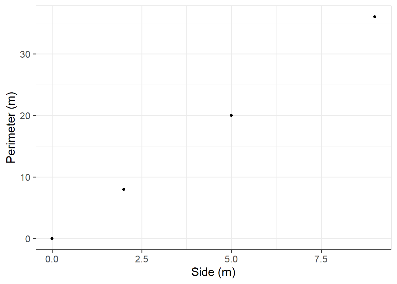 Create a data set called squares containing the perimeter of four squares having sides of length \(0, 2, 5, 9\) metres, and then plot the squares data as points on a scatterplot.