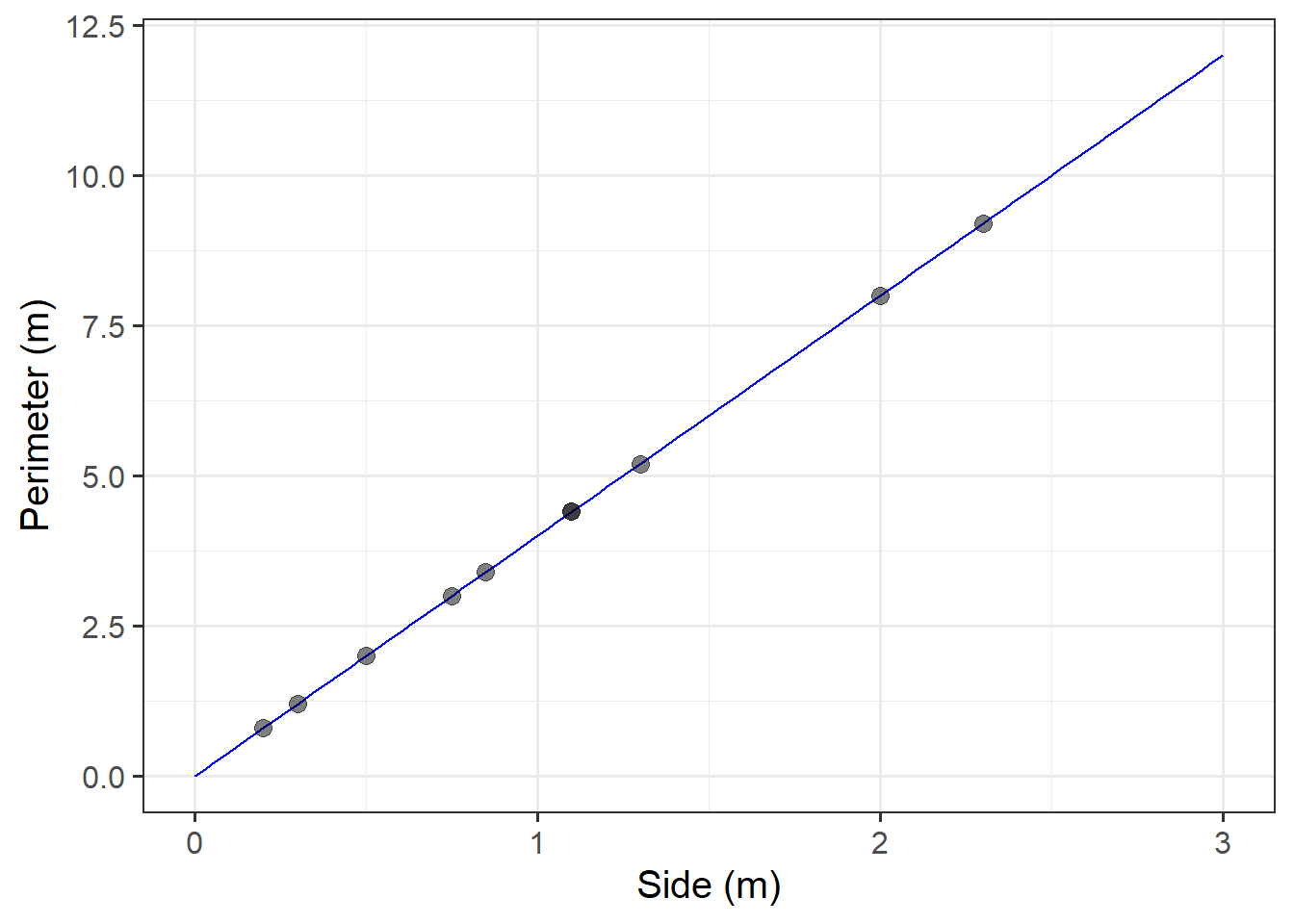 geom_smooth(method = lm, se = FALSE)Comment on any differences between the lines representing the linear relationship between (a) the side and perimeter of square and (b) height and handspan.