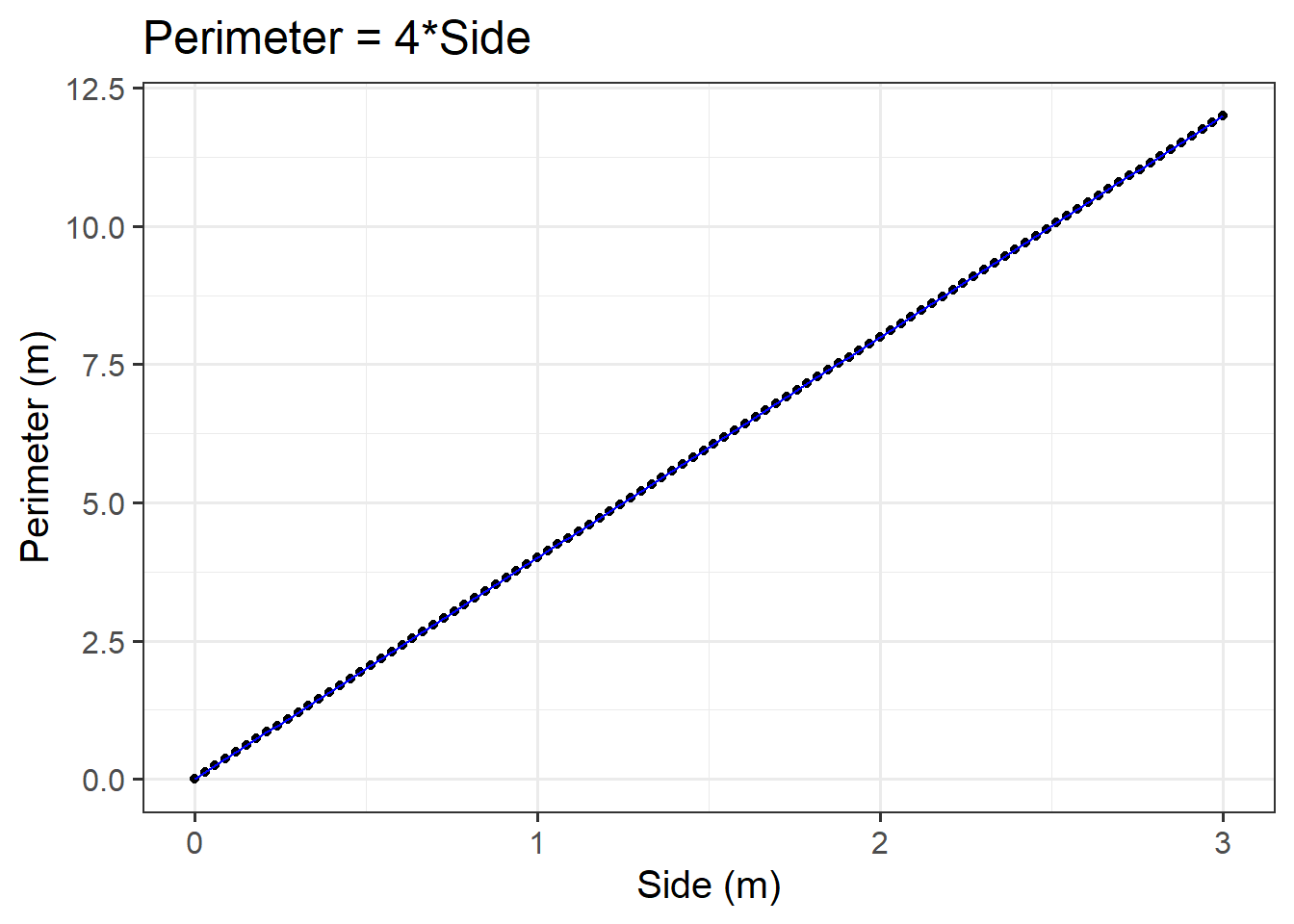 - Visualise the functional relationship between side and perimeter of squares. To do so, use the function