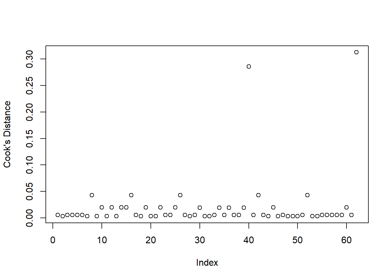 To check for influential observations, we can use cooks.distance(), and plot this using plot(). Alternatively, you can specify which = 4 when plotting your fitted model. In logistic regression, we can use the arbitrary cut-offs of 0.5 (moderately influential) or 1 (highly influential) to describe influential points.