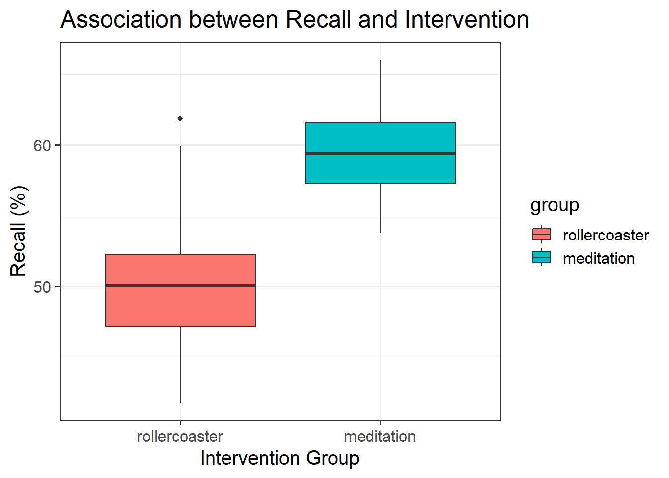 geom_boxplot()may be most appropriate to use. - Make sure to comment on any observed differences among the sample means of the four treatment conditions.
