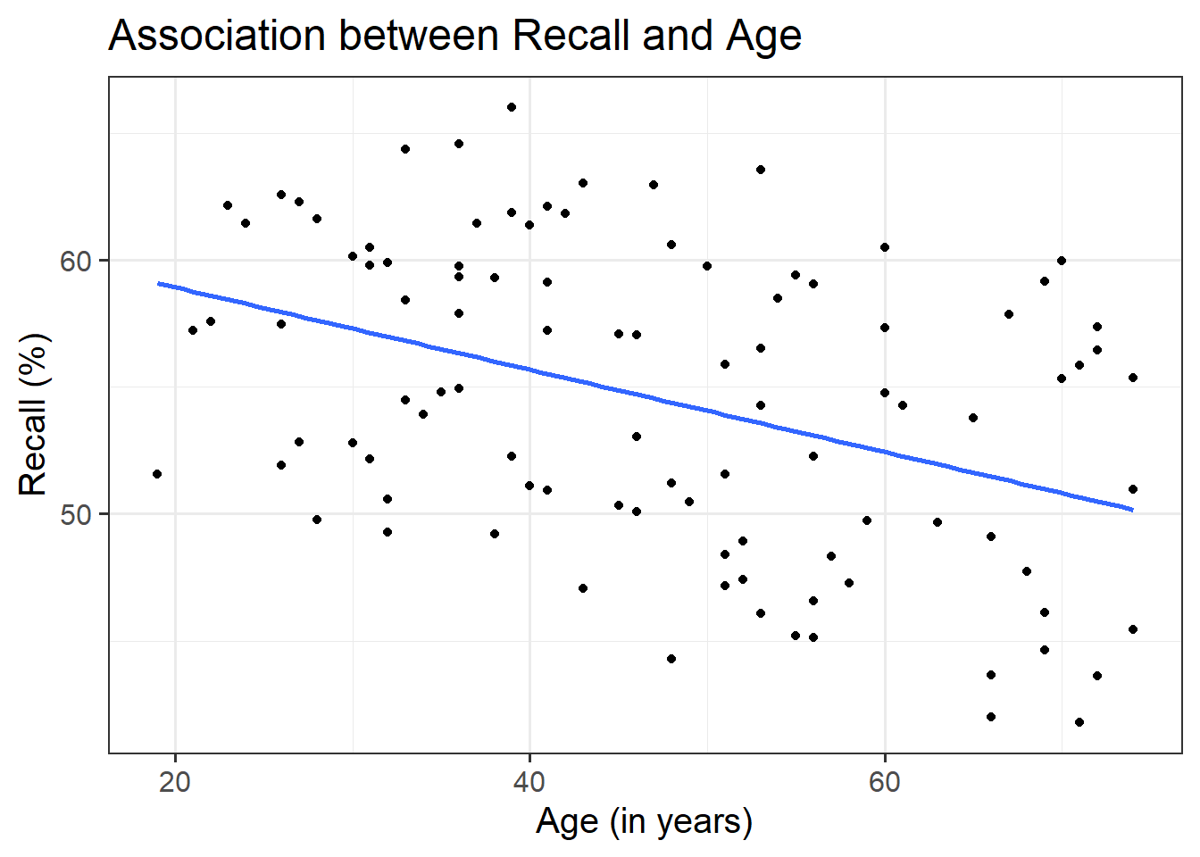 \[ \text{Recall} = \beta_0 + \beta_1 \cdot Age + \epsilon \\ \]