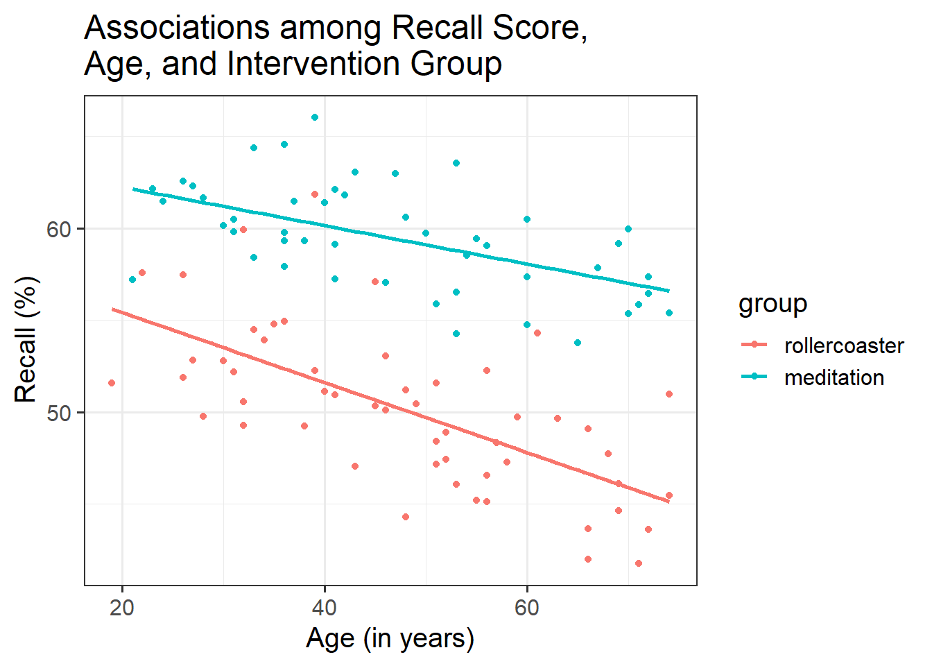 geom_smooth()to superimpose the best-fitting line describing the association of interest for each intervention group.