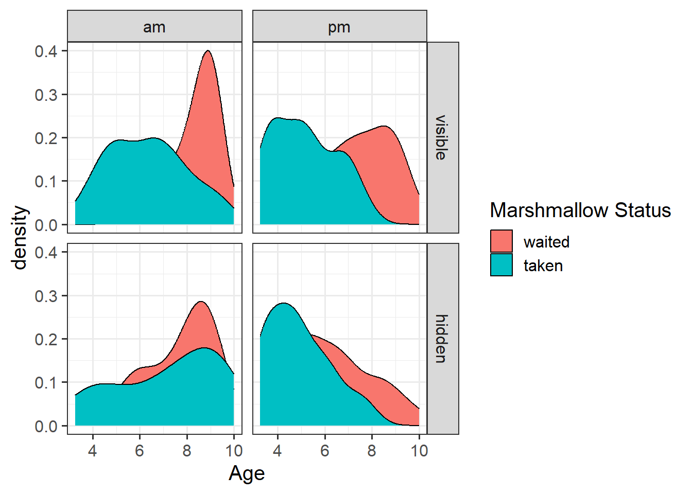 - Does the probability of delaying gratification change as a function of age, marshmallow visibility, and time of day?