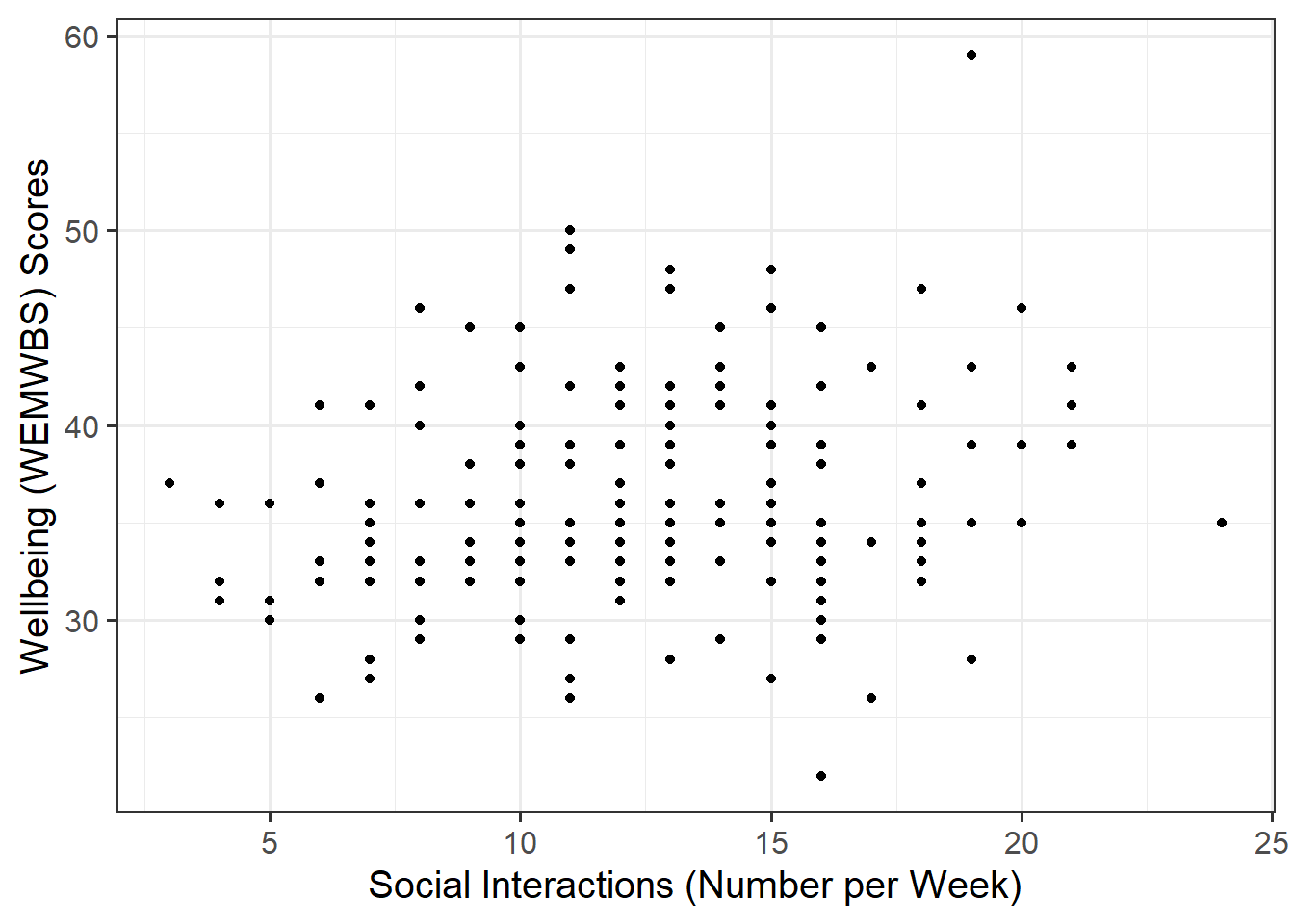 We are trying to investigate how wellbeing varies by varying numbers of weekly social interactions. Hence, wellbeing is the dependent variable (on the y-axis), and social interactions is the independent variable (on the x-axis). Checking the bivariate examples flashcard might help.