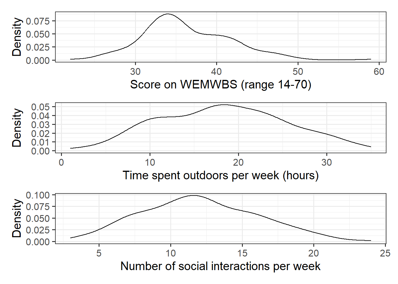 Alongside descriptive statistics, visualize the marginal distributions of the wellbeing, outdoor_time, and social_int variables.