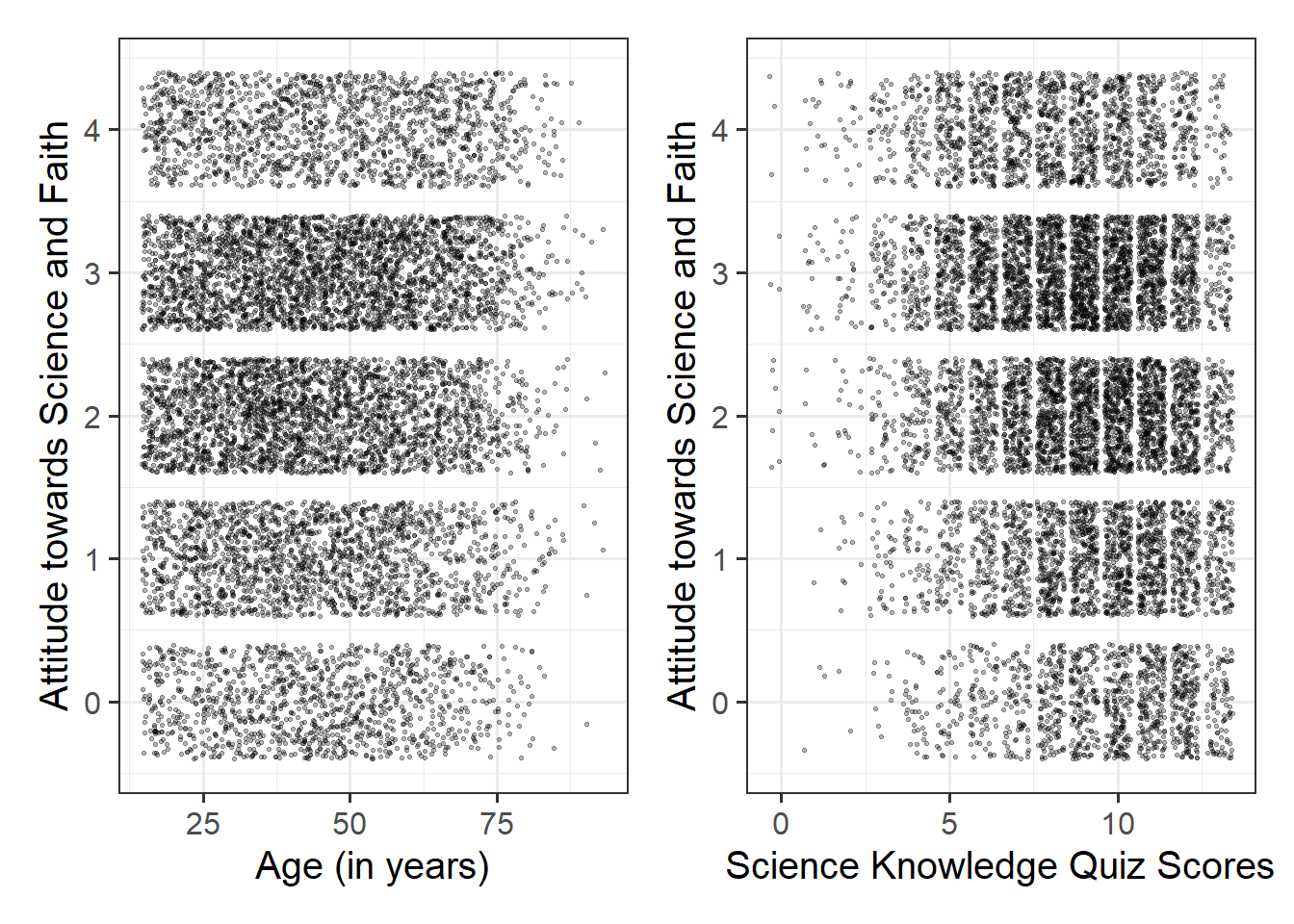 Note that using geom_point() here might not be the best idea - all we would see from the plot is all combinations of Attitude towards Science and Faith and a) Age and b) Science Knowledge that were observed in the data, and this is not very informative: