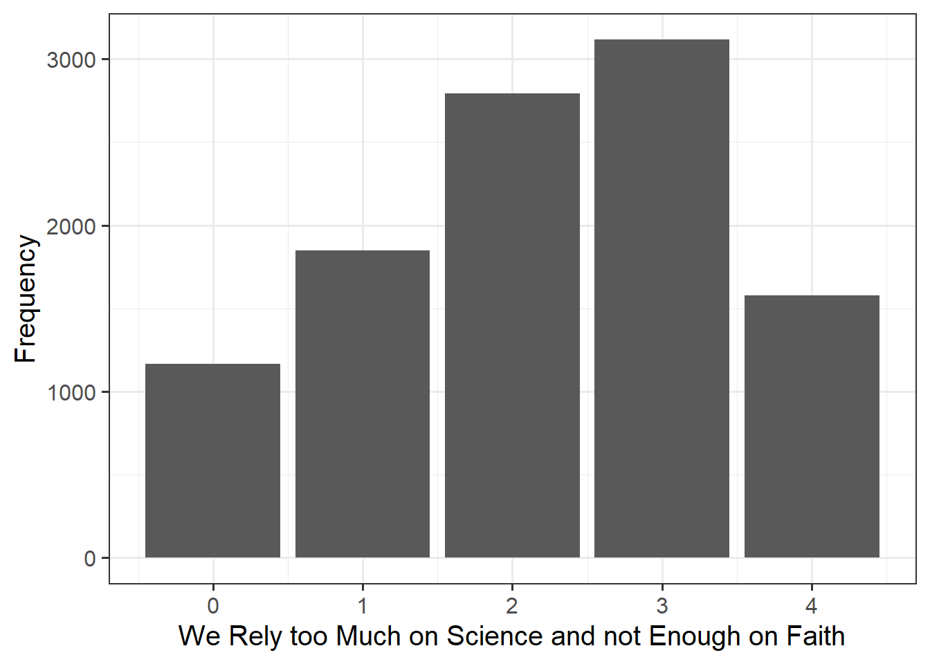 | toomuchscience | Attitude to science and faith. Response to the question - We rely too much on science and not enough on faith. Responses were recorded on a 5-point scale from strongly disagree (0) to strongly agree (4) |