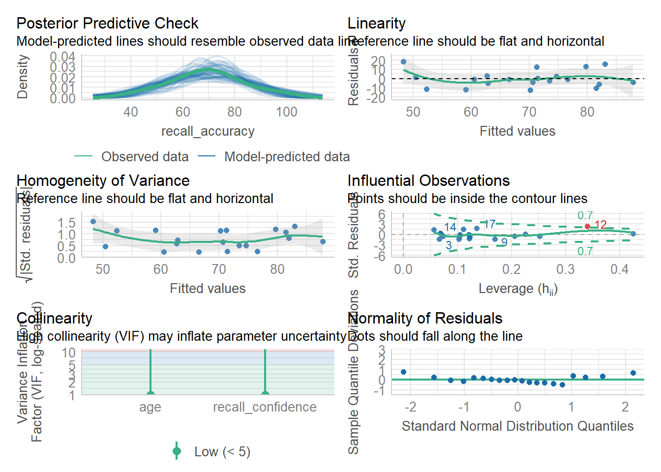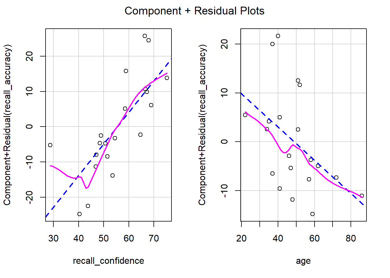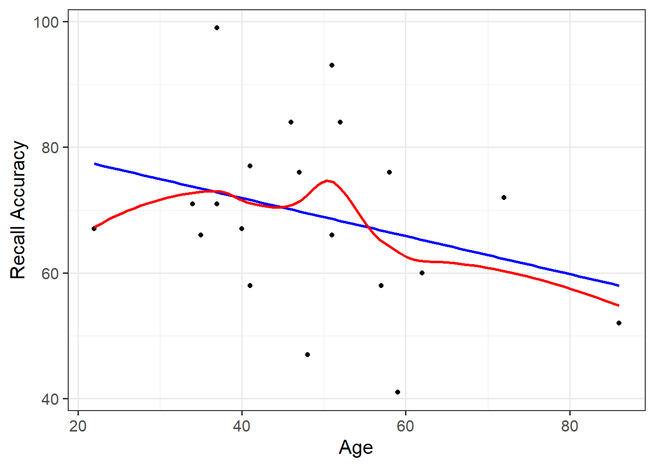 1. Yes, the error term is gone. This is because the line of best-fit gives you the prediction of the average recall accuracy for a given age, and not the individual recall accuracy of an individual person, which will almost surely be different from the prediction of the line.↩︎