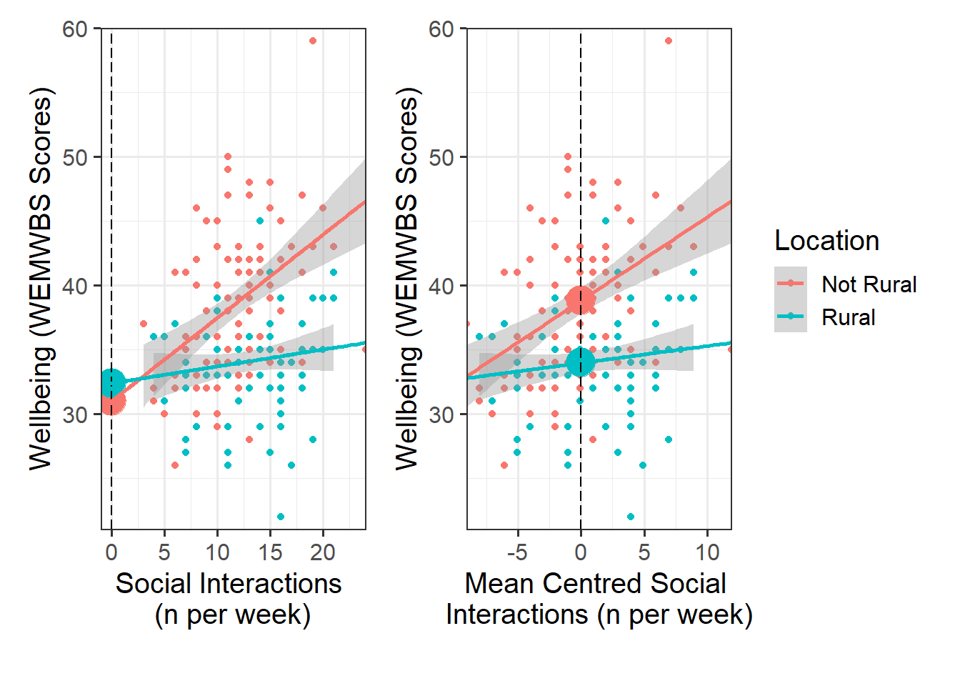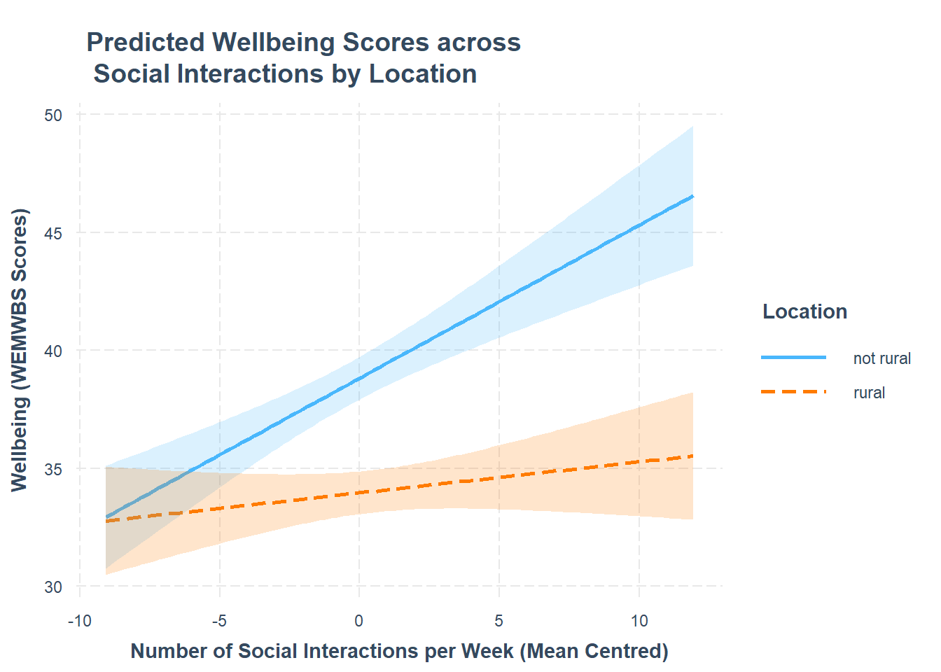 No participants in our dataset had zero hours of social interactions per week (the lowest was 3), and we’re likely not interested in differences between rural and non-rural residents who have never interacted with others.