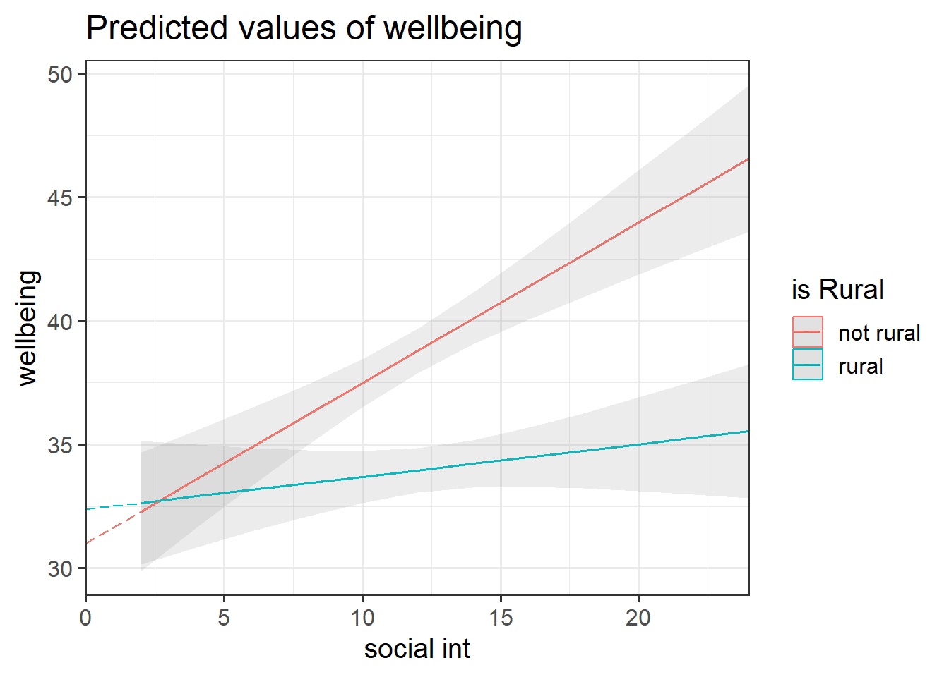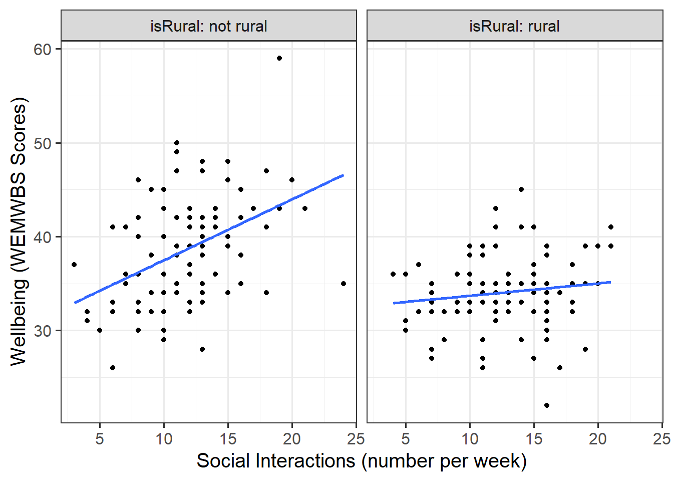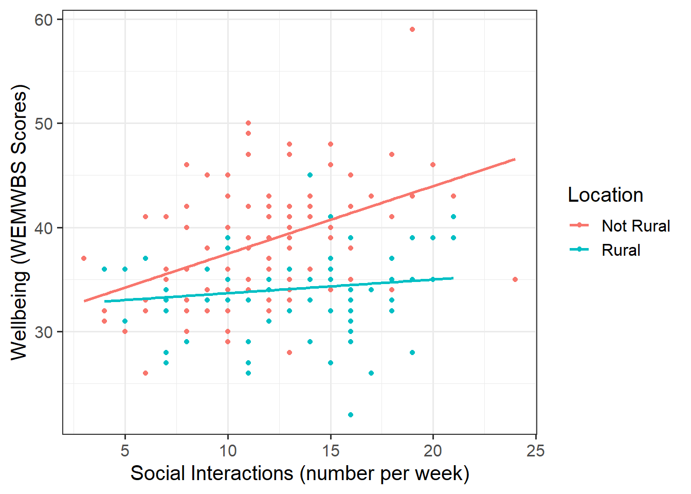 Figure 1: Multiple regression model: Wellbeing ~ Social Interactions * is Rural