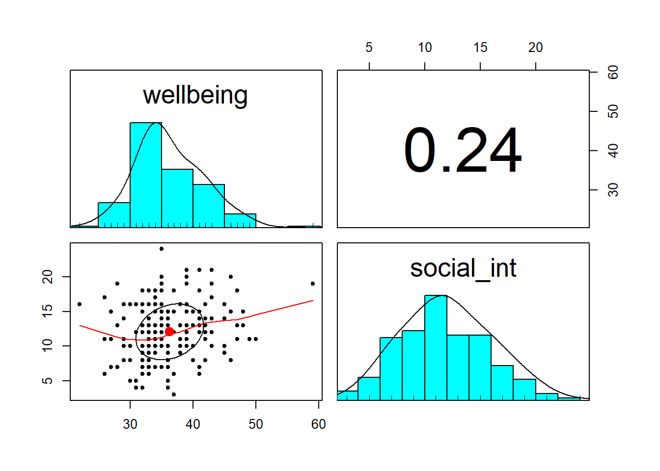 2. The pairs.panels() function from the psych package can plot all variables in a dataset against one another. This will save you the time you would have spent creating individual plots, but is only useful for continuous variables.