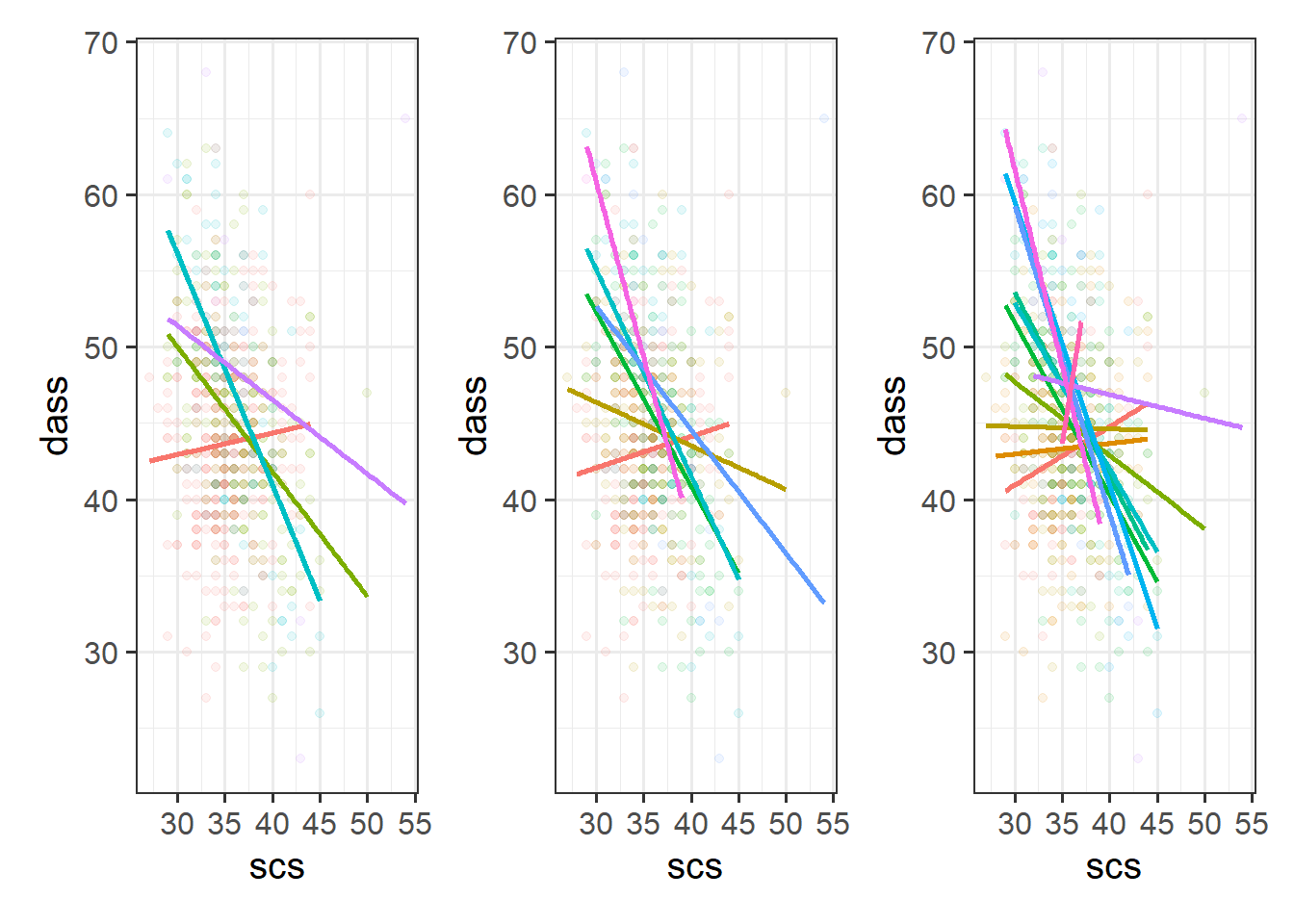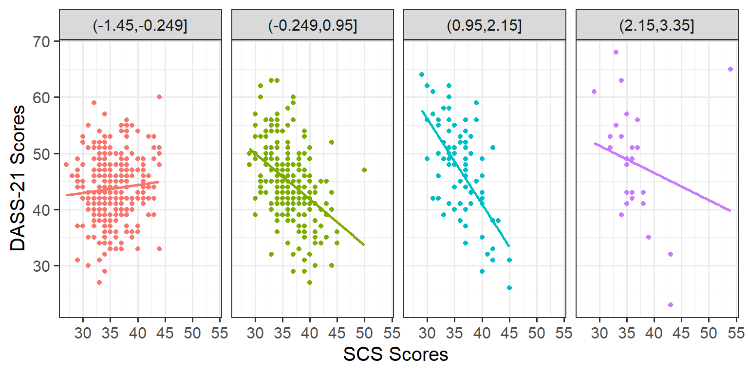 Plot the association between scores on the SCS and scores on the DASS-21, for each group of the variable we just created.