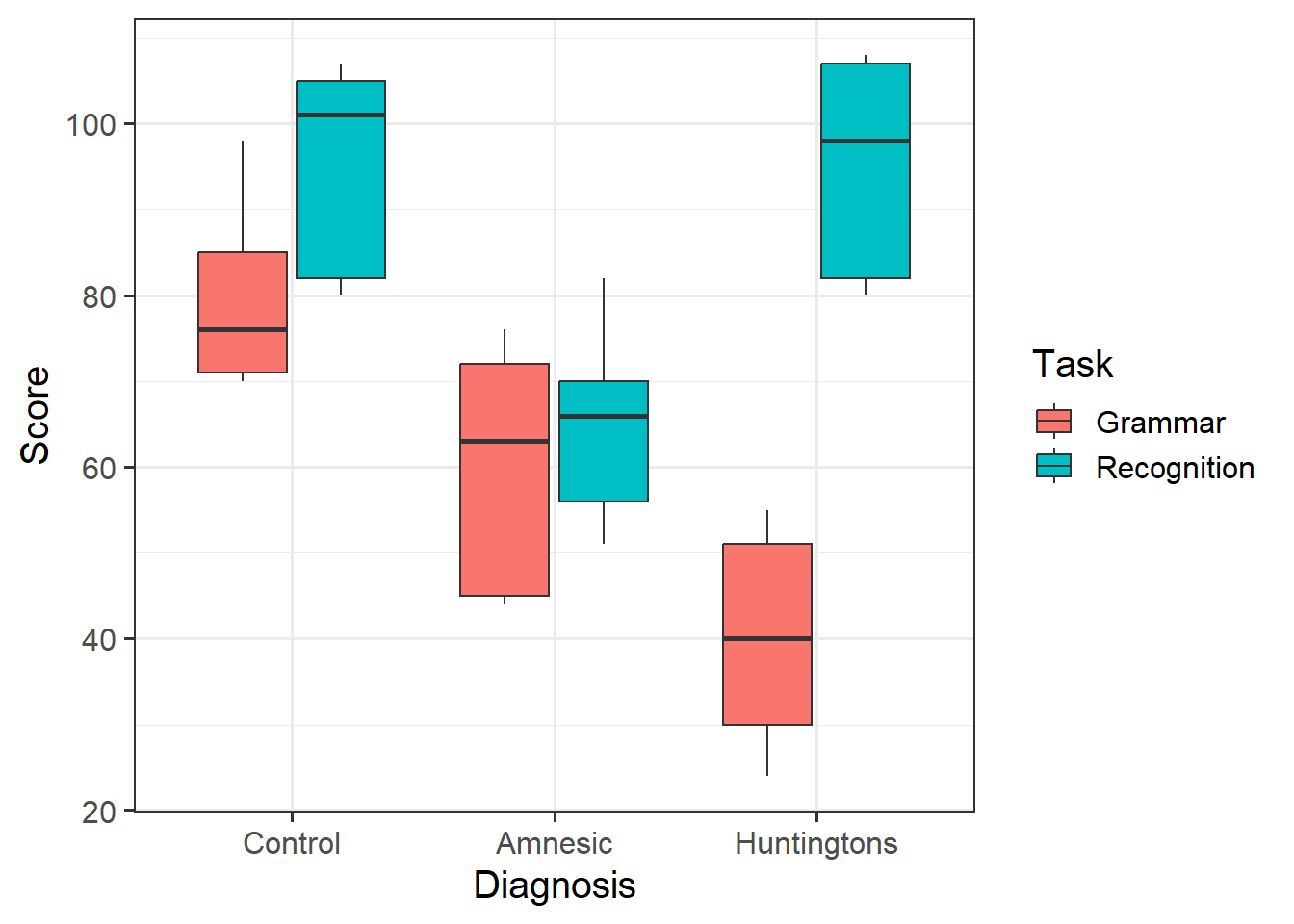 | Task | Task tells us to which one of two tasks each study participant was randomly assigned to: 1 = Grammar (which consists of classifying letter sequences as either following or not following grammatical rules), and 2 = Recognition (which consists of recognising particular stimuli as stimuli that have previously been presented during the task) |