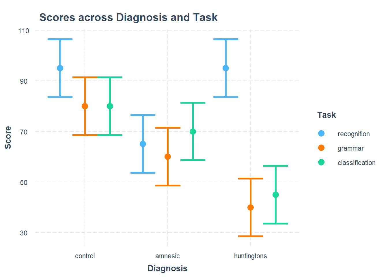 Conduct exploratory pairwise comparisons to compare all levels of Diagnosis with all levels of Task, applying no correction (note that Tukey will be automatically applied since we are comparing groups of means, so you will need to overwrite this).