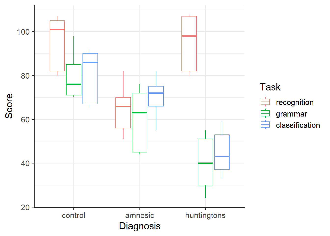 | Task | Task tells us to which one of three tasks each study participant was randomly assigned to: 1 = Grammar (which consists of classifying letter sequences as either following or not following grammatical rules), 2 = Classification (which consists of classifying stimuli into certain groupings, based on previously indicated information about the groups characteristics), and 3 = Recognition (which consists of recognising particular stimuli as stimuli that have previously been presented during the task) |