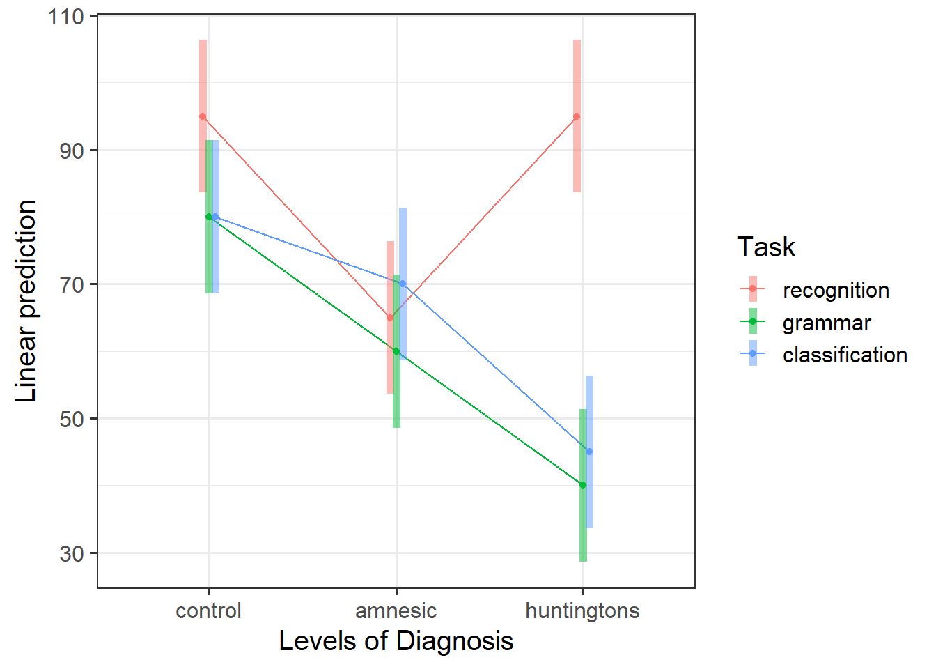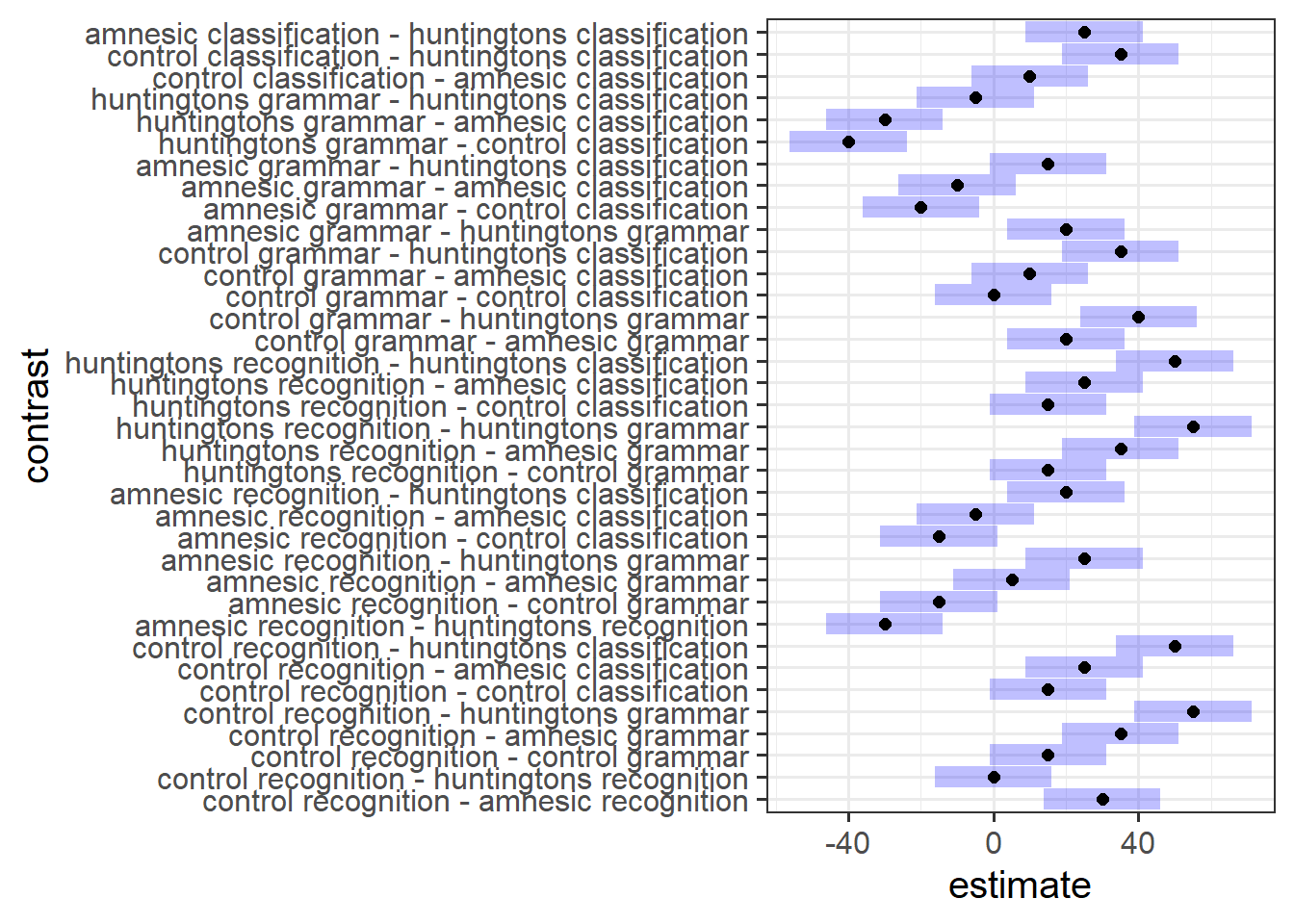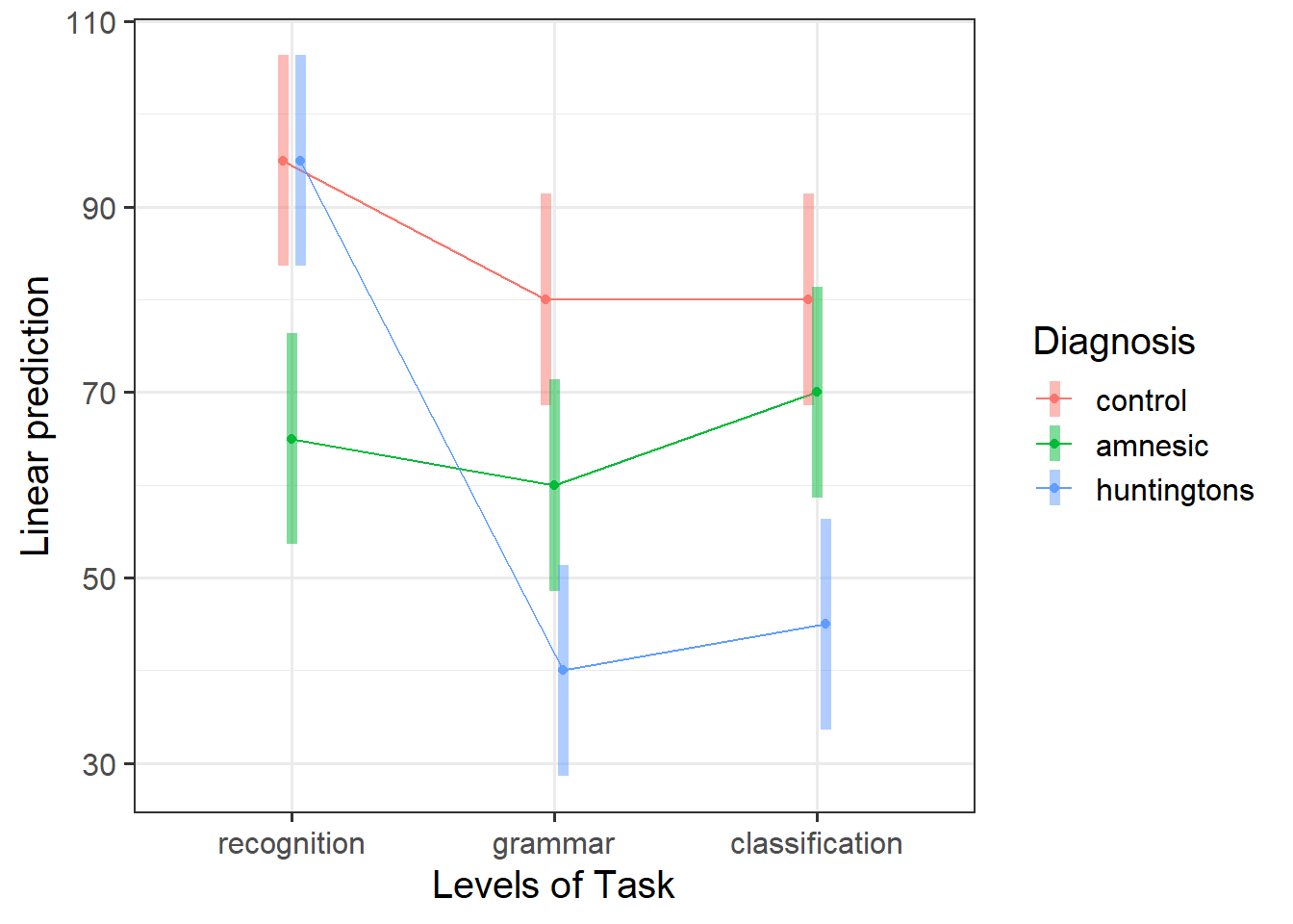In terms of the diagnostic groups, we want to compare the individuals with amnesia to those with Huntingtons. This corresponds to a contrast with coefficients of 0, 1, and −1, for control, amnesic, and Huntingtons, respectively.