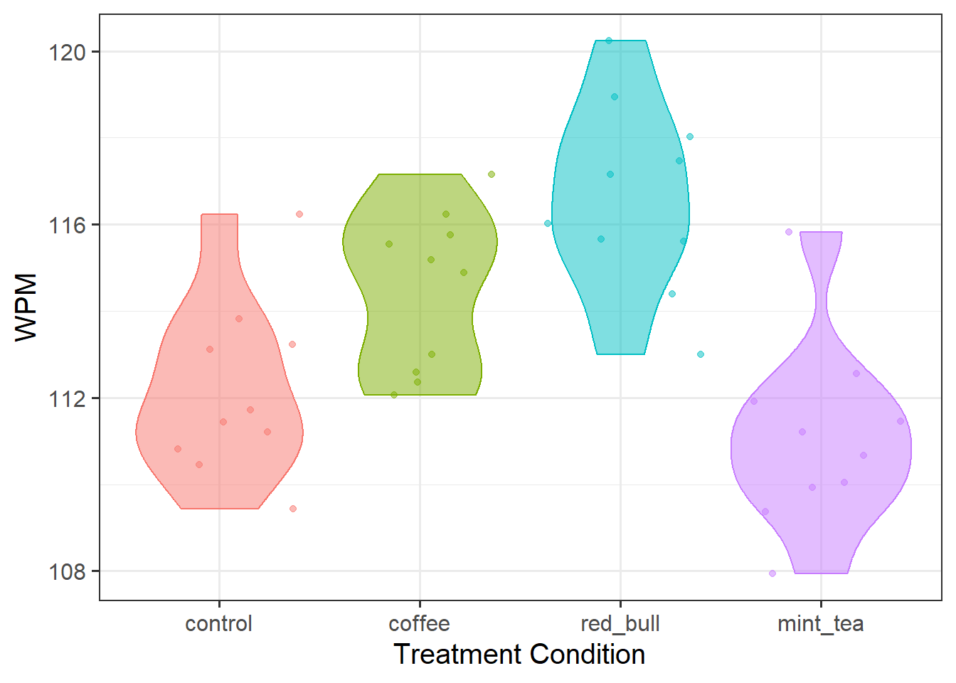 To investigate if the number of words typed per minute (WPM) differs among caffeine treatment conditions, the researchers conducted an experiment where participants were randomly allocated to one of four treatment conditions. Two of these conditions included non-caffeinated drinks - control (water) and mint tea, and the other two caffeinated drinks - coffee and red bull.