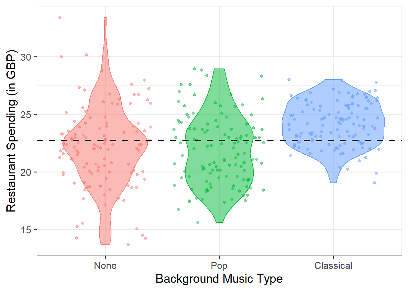 The group of researchers got in touch with a local restaurant and asked them to alternate silence, popular music, and classical music on successive nights over 18 days. On those nights they recorded the average spend per person for each table.