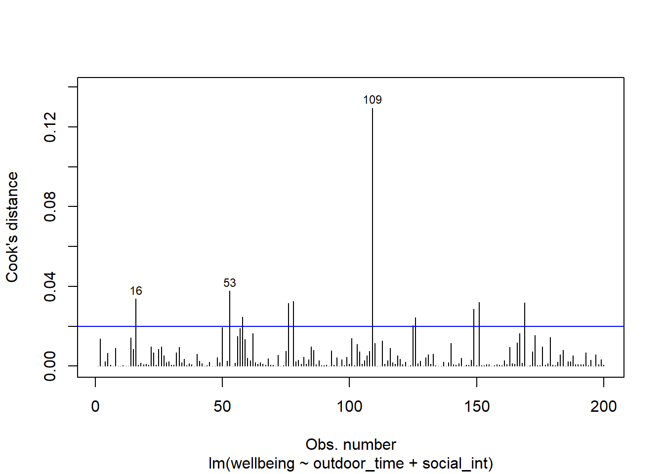 - Looking at the Cook’s Distance values, are there any highly influential points?