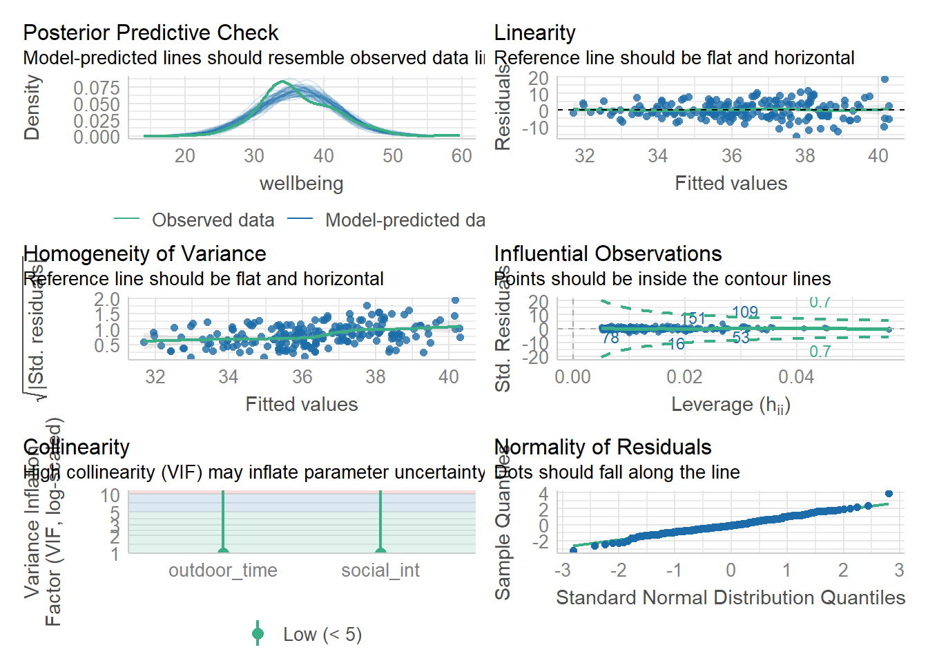 Let’s start by using check_model() for our wb_mdl1 model - we can refer to these plots as a guide as we work through the assumptions questions of the lab.