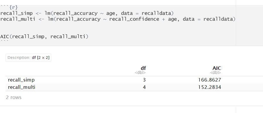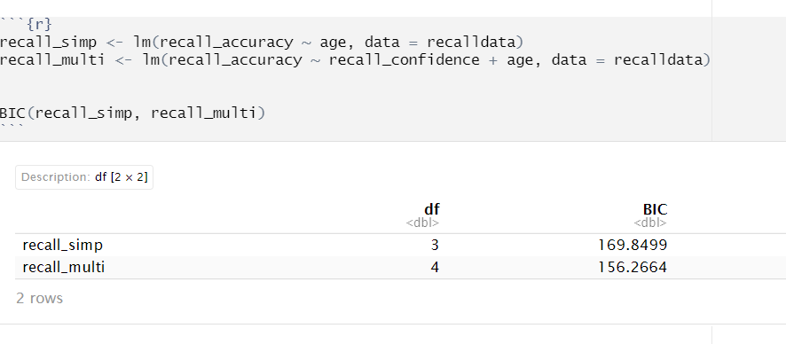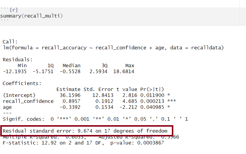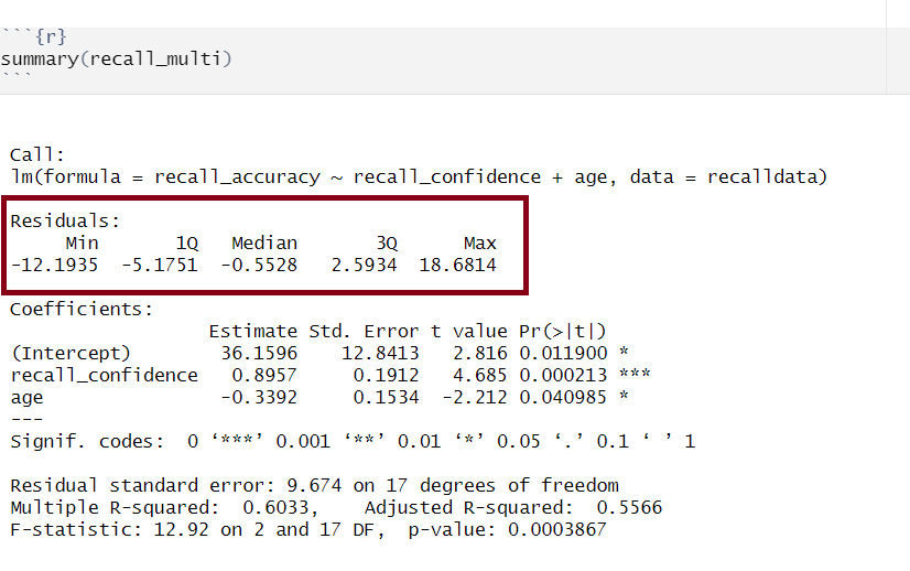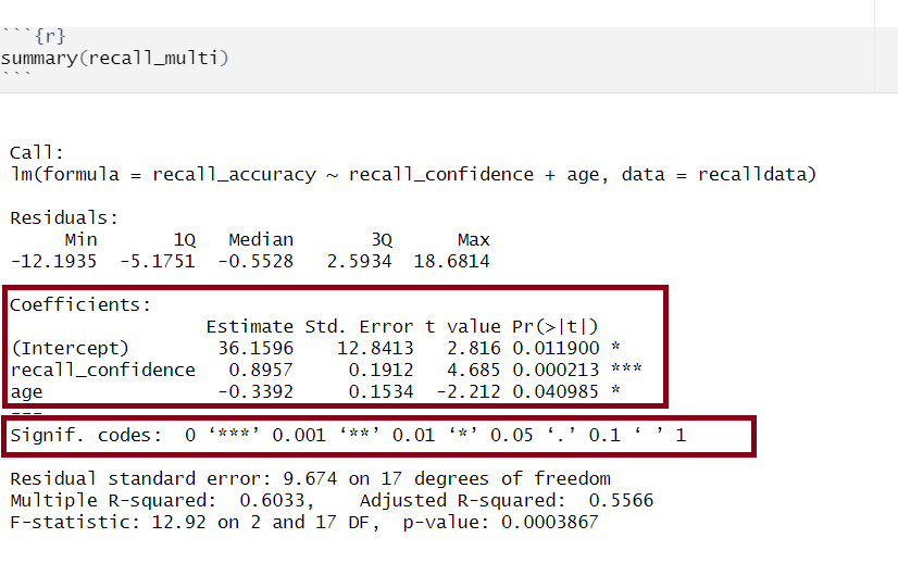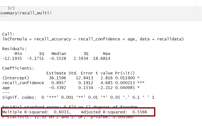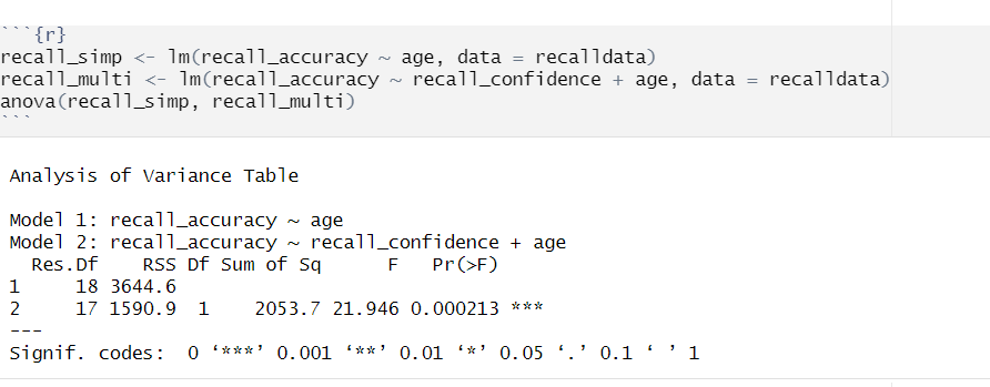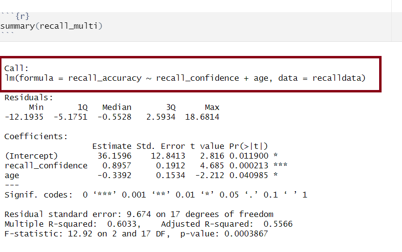 The linear model with recall confidence and age explained a significant amount of variance in recall accuracy beyond what we would expect by chance \(F(2, 17) = 12.92, p < .001\).