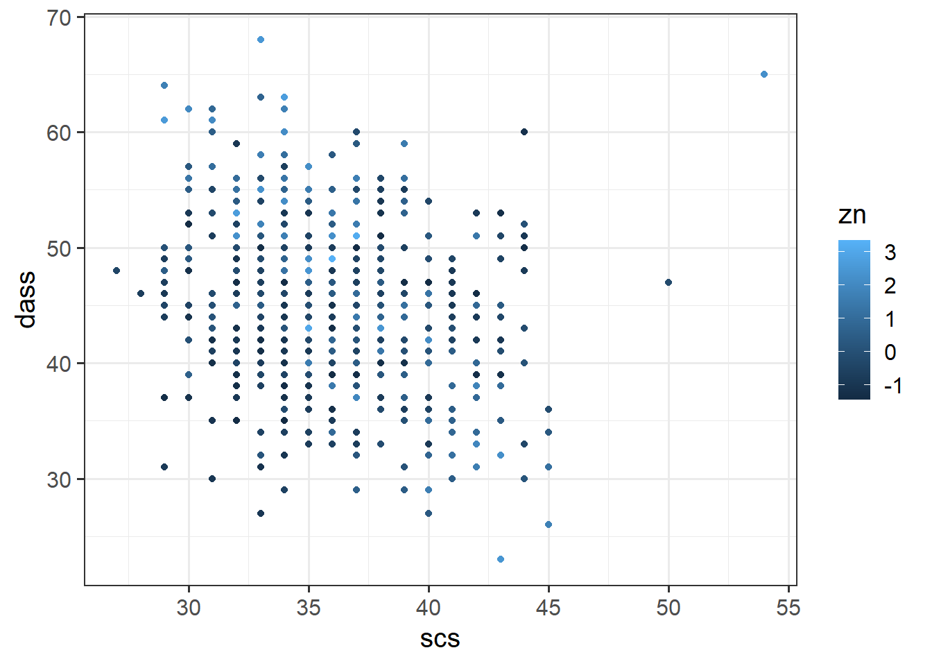 Plot the association between scores on the SCS and scores on the DASS-21, for each group of the variable we just created.