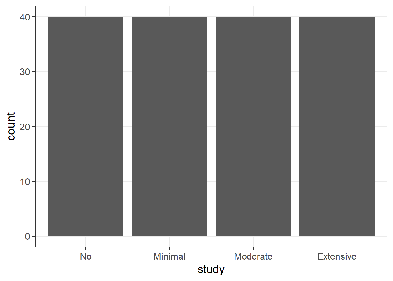 | study | Study time (levels = No, Minimal, Moderate, Extensive) |