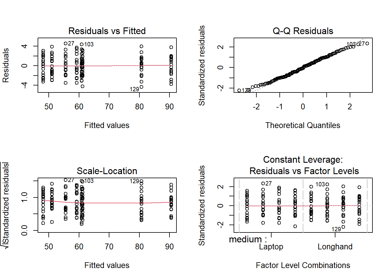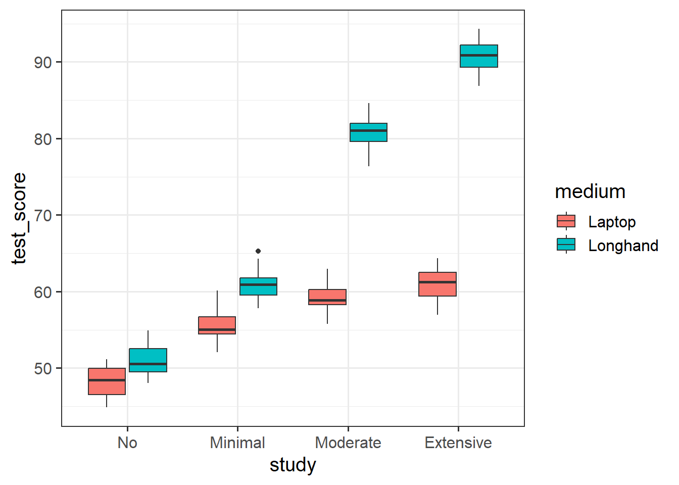 In this lab you will be presented with the output from a statistical analysis, and your job will be to write-up and present the results. We’re going to use a simulated dataset based on a paper (the same that you have worked on in lectures this week) concerning test outcomes and note taking methods.