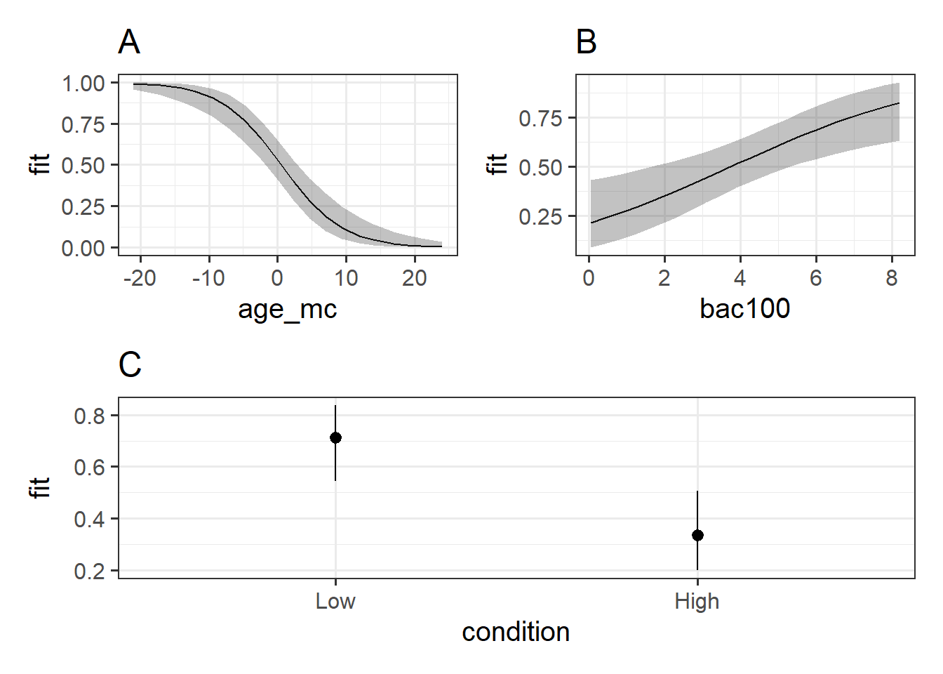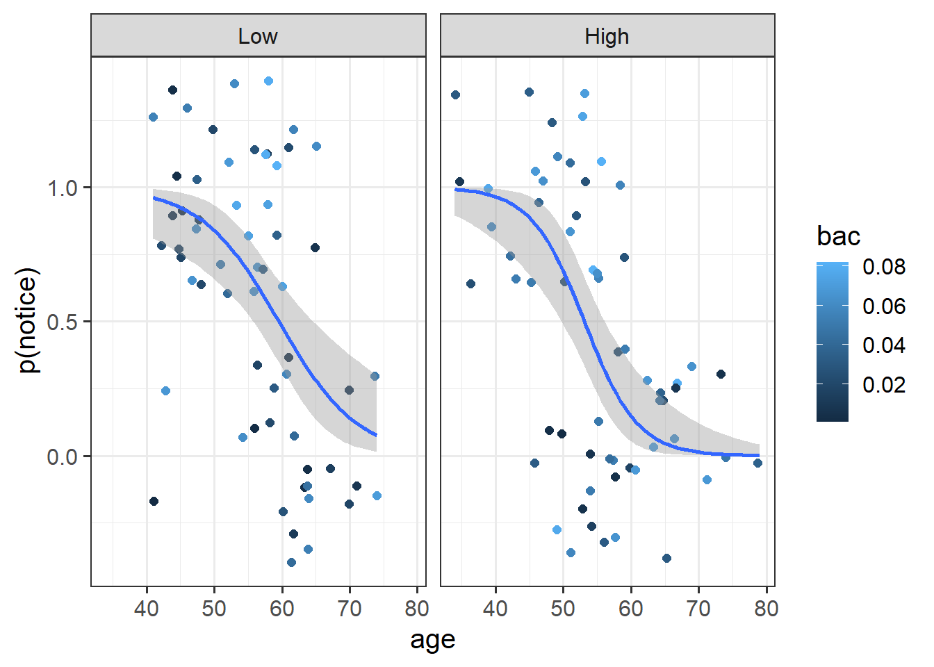 Firstly, produce plots of the predicted probabilities of noticing the swap as a function of (a) age, (b) BAC, and (c) condition.