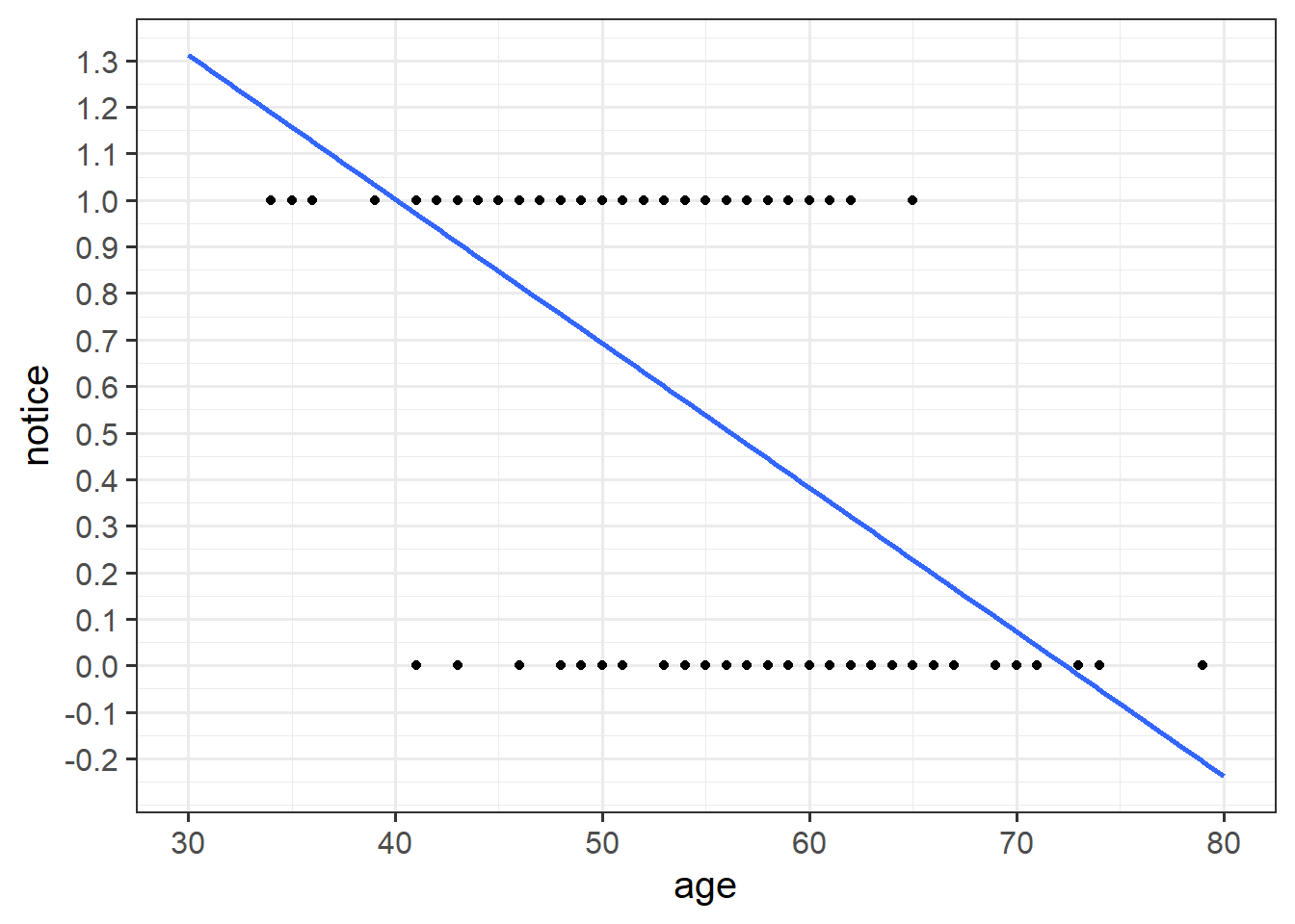 For the moment, lets just consider the association between notice and age. Visually following the line from the plot produced below, what do you think the predicted model value would be for someone who is aged 30? What does this value mean?