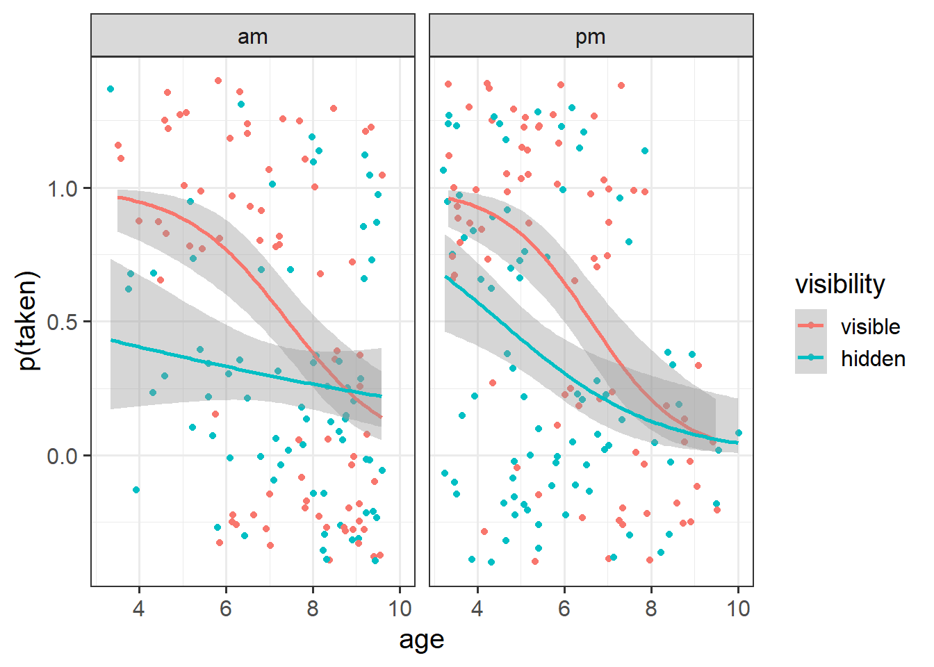 Explore the associations among the ability to delay gratification and age, visibility, and time of day.